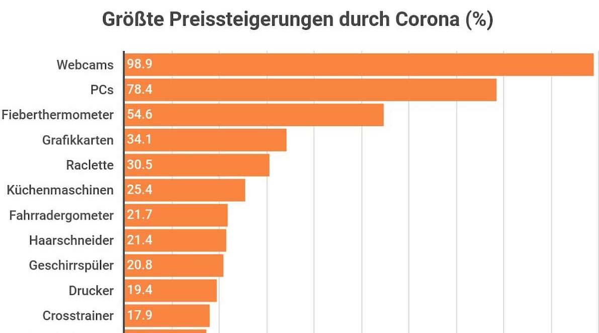 Im Computerbereich sind neben Webcams (99% Preissteigerung) insbesondere Desktop-PCs (79%), Grafikkarten (34%), Drucker (19%) und auch Gamingstühle (13%) betroffen. Bei Küchengeräten ging deutlich moderater zu. Insbesondere Raclettes (31%), Küchenmaschinen (25%), Geschirrspüler (21%), Fritteusen (17%), Milchaufschäumer (14%), Eismaschinen und Kühlschränke (je 13%) legten preislich zu. Geschlossene Fitnessstudios und Sportvereine wirkten sich insbesondere auf die Nachfrage von Fahrradergometern (22%), Crosstrainern (18%) und Rudergeräten (14%) aus.