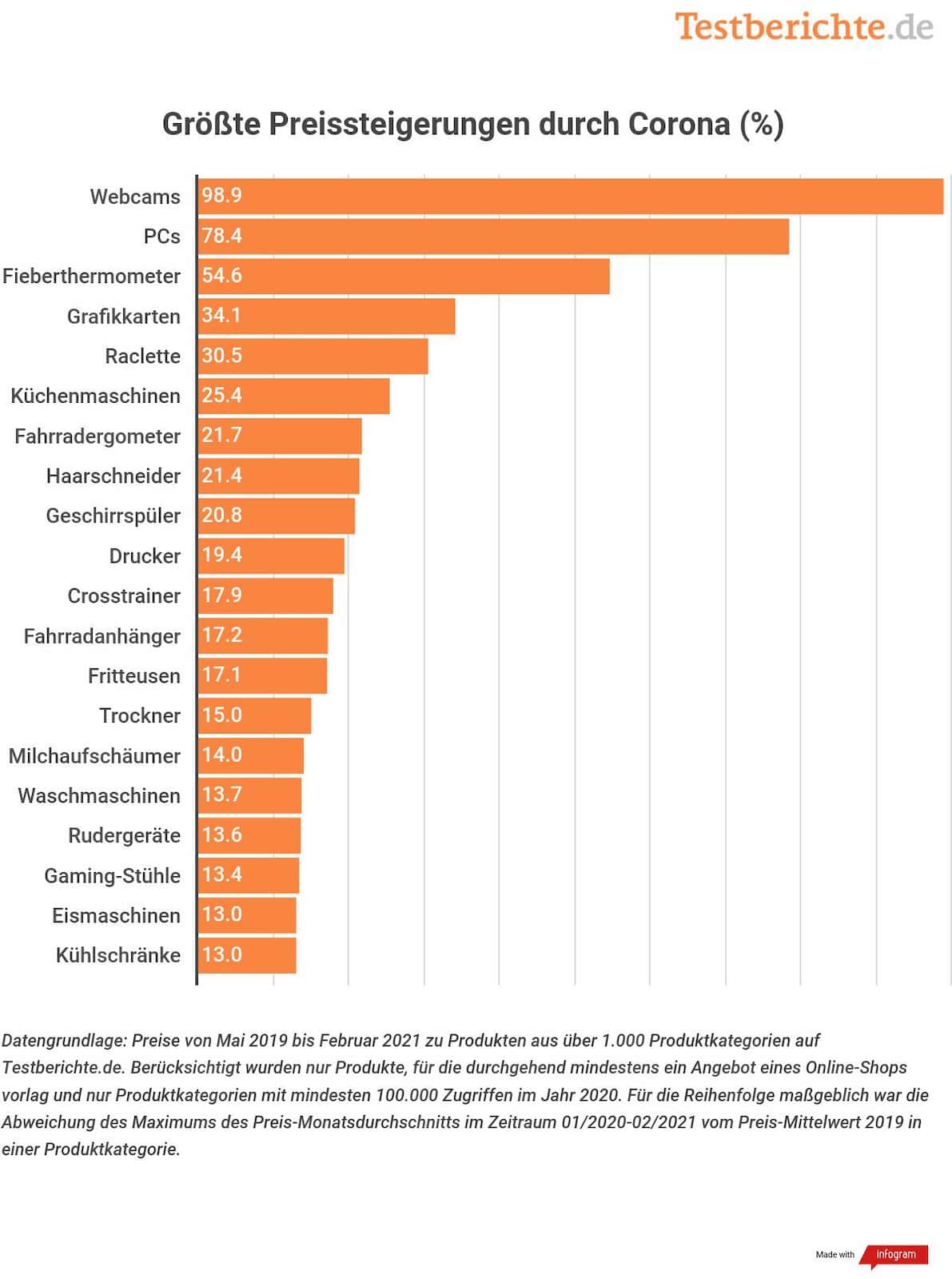 Im Computerbereich sind neben Webcams (99% Preissteigerung) insbesondere Desktop-PCs (79%), Grafikkarten (34%), Drucker (19%) und auch Gamingstühle (13%) betroffen. Bei Küchengeräten ging deutlich moderater zu. Insbesondere Raclettes (31%), Küchenmaschinen (25%), Geschirrspüler (21%), Fritteusen (17%), Milchaufschäumer (14%), Eismaschinen und Kühlschränke (je 13%) legten preislich zu. Geschlossene Fitnessstudios und Sportvereine wirkten sich insbesondere auf die Nachfrage von Fahrradergometern (22%), Crosstrainern (18%) und Rudergeräten (14%) aus.