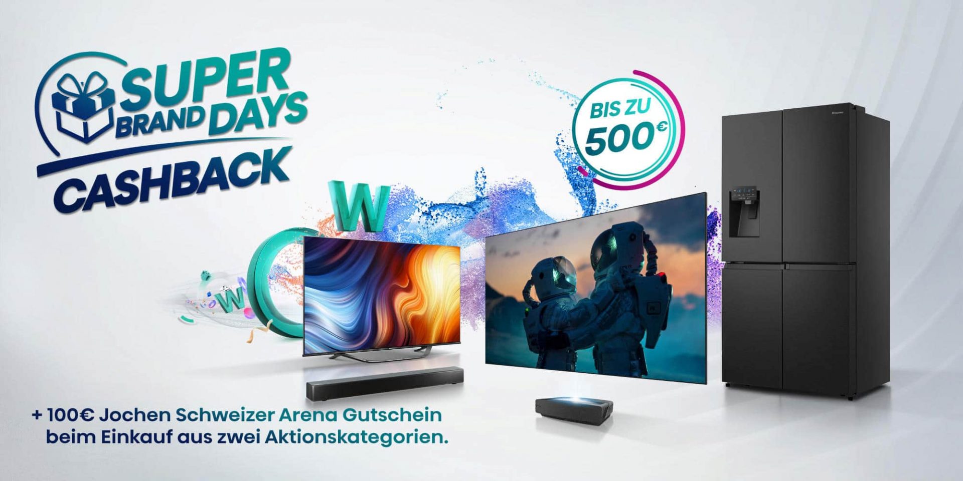 Im Rahmen der Super Brand Days bei Hisense vom 15. Mai bis 30. Juni 2023 lockt beim Kauf von ausgewählten Hausgeräten, TVs, Laser-TVs und Soundbars ein Cashback von bis zum 500 Euro. Besonders treue Hisense-Fans dürfen sich zudem über exklusive Jochen Schweizer Arena Gutscheine freuen.