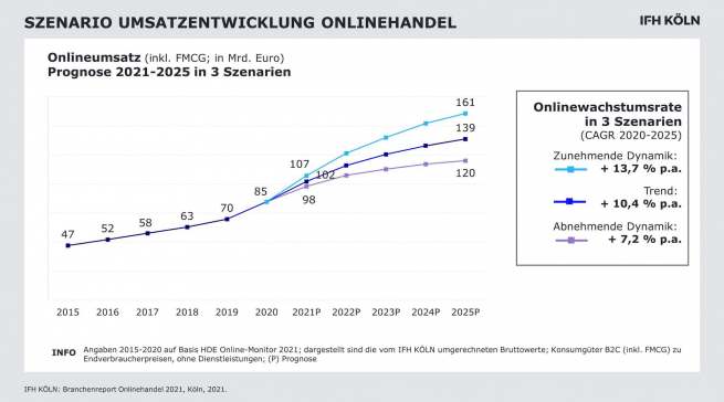 Sollte die Onlinedynamik im Handel weiter zunehmen, ist bis 2025 ein Onlineanteil von rund 21% am Einzelhandelsumsatz möglich – das entspräche rund 161 Milliarden Euro Online-Marktvolumen. Doch auch die Trendfortschreibung der aktuellen Entwicklung – das mittlere Szenario – kann sich sehen lassen: Hiernach wächst der deutsche Onlinehandel in den nächsten vier Jahren jährlich um rund 10% und realisiert 2025 etwa 139 Milliarden Euro Umsatz.