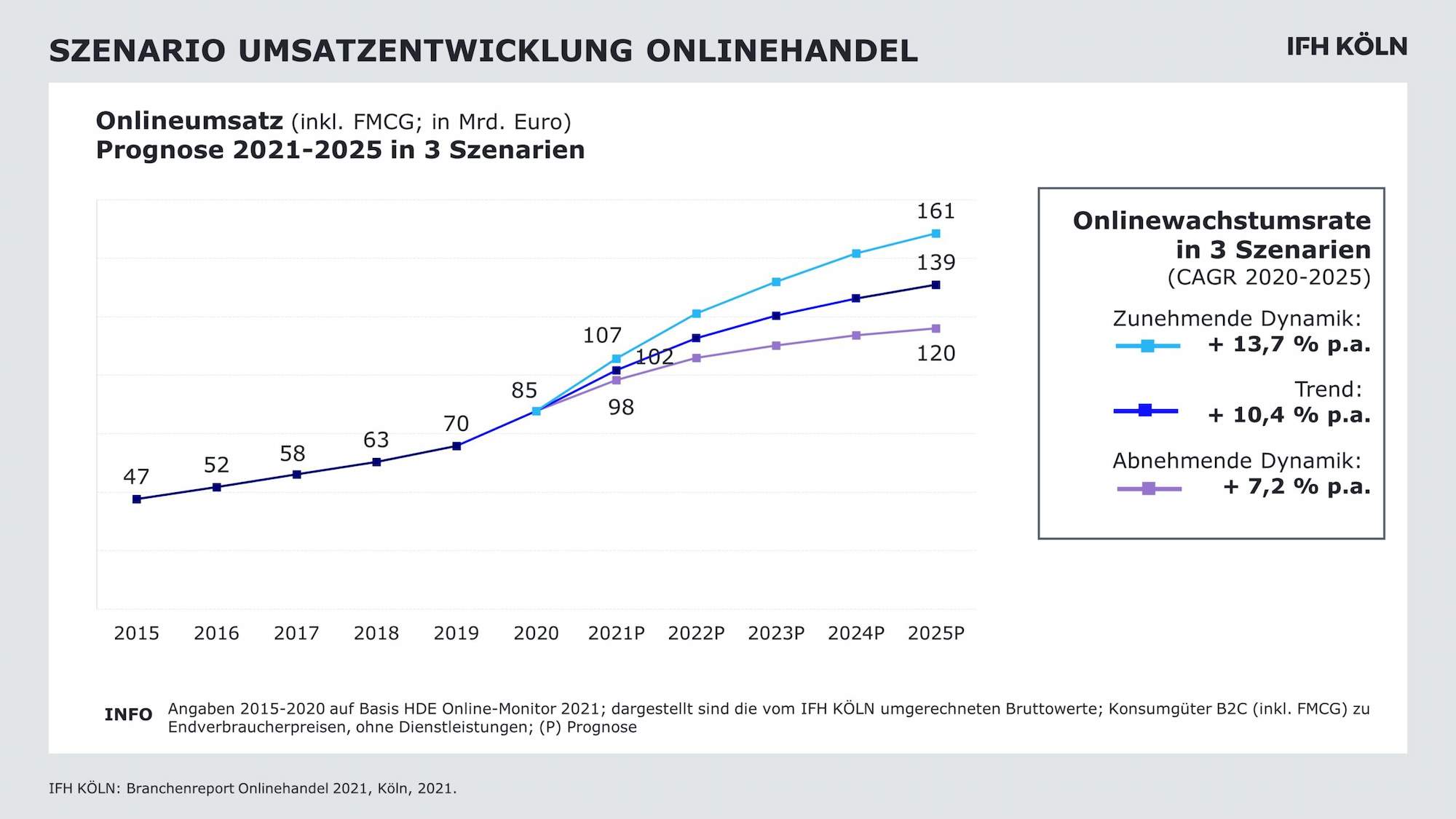Für das Ende des vergangenen Jahres haben die Marktexperten des IFH KÖLN ein Szenario mit drei möglichen Ausprägungen erstellt und sagen für die Onlinehandelsentwicklung ein Wachstum zwischen 16 und 27% voraus. Dass die 100-Milliarden-Euro-Marke in 2021 erstmals gefallen ist, gilt demnach als recht wahrscheinlich.