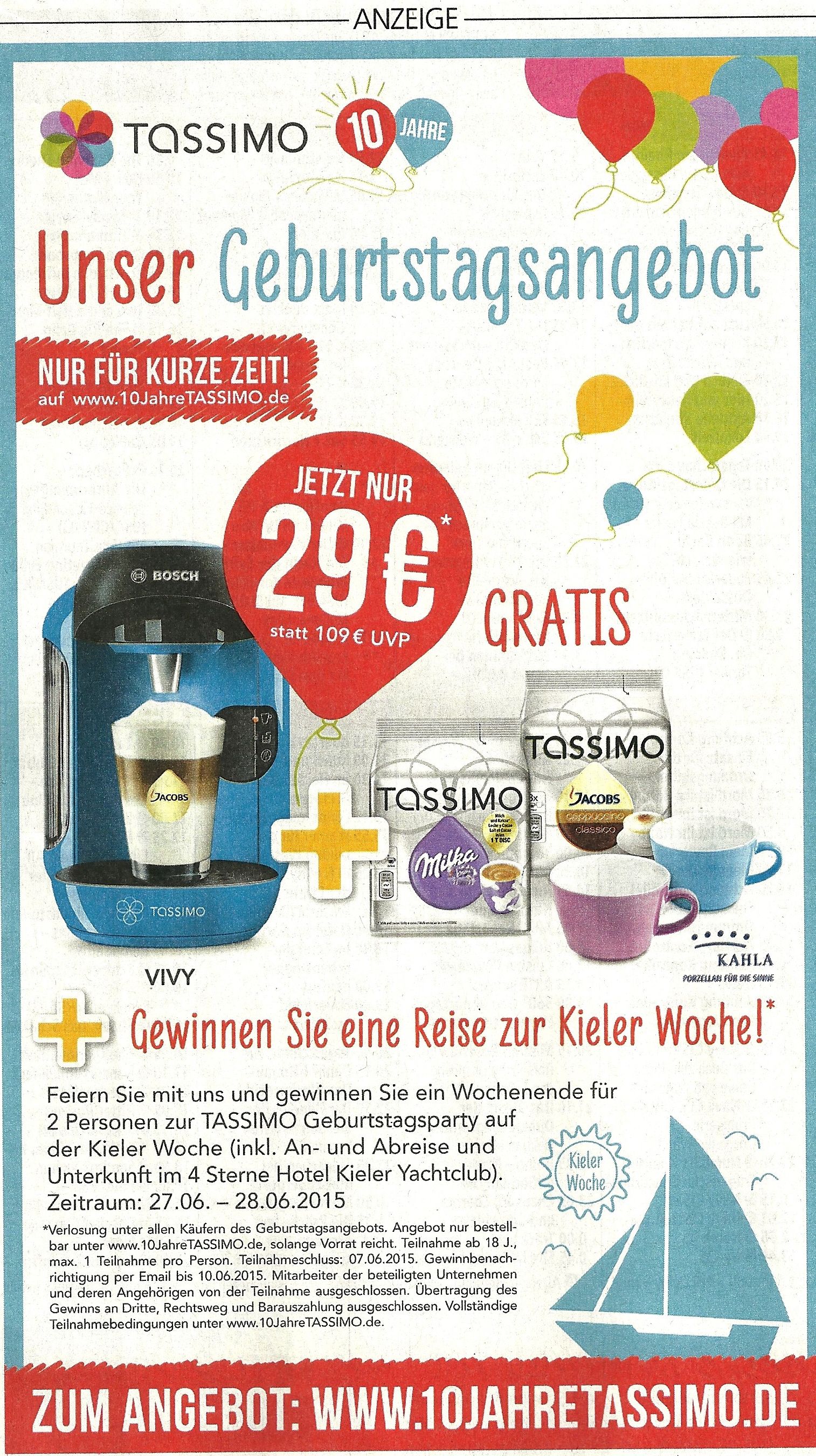 Mit „Einkaufaktuell“ bietet die Deutsche Post dem „Geschäftskunden maßgeschneiderte Haushaltswerbung“. In den größten 27 Ballungsräumen im Land werden rund 20 Millionen Haushalte erreicht. Was zunächst nach einem Preis wie von der Resterampe anmutet, hat System: Die Tassimo Fidelia gibt zum Geburtstag für 39 Euro (anstatt 139,- Euro UVP) inklusive Latte Macchiato Gläser Set von WMF und Kaffee Discs, die Tassimo Charmy für 74 Euro (anstatt 159,- Euro UVP) inklusive Latte Macchiato Gläsern von Ritzenhoff und Kaffee Dics.