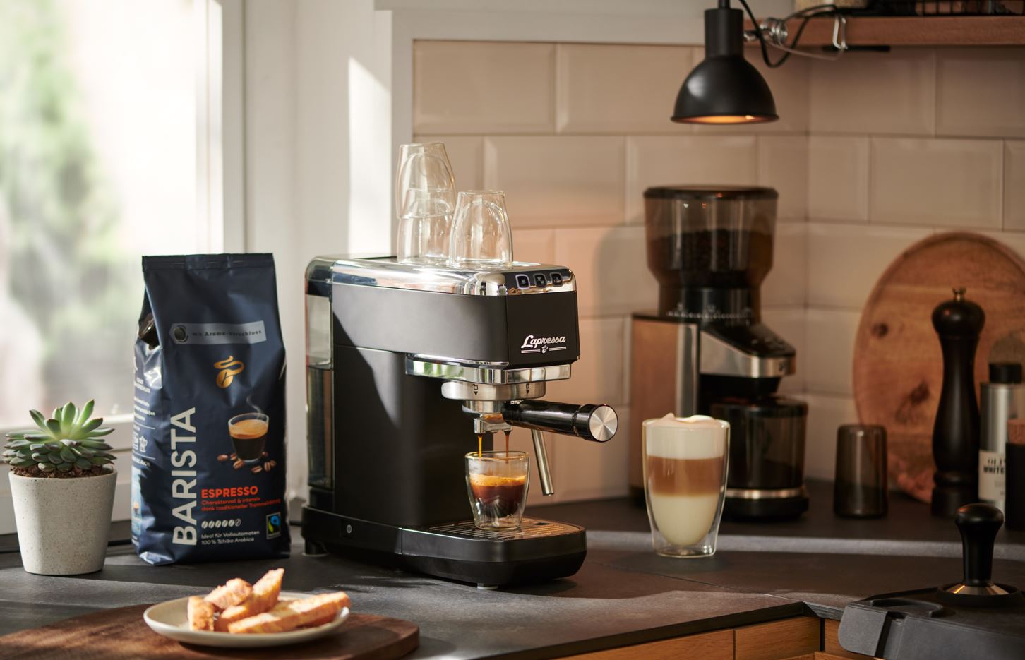 zum Andrücken des Kaffeepulvers, Tampermatte und Knock-Box zum Ausschlagen des Kaffeemehls. Und natürlich stilechte Espressogläser. Gibt es auch alles bei Tchibo.
