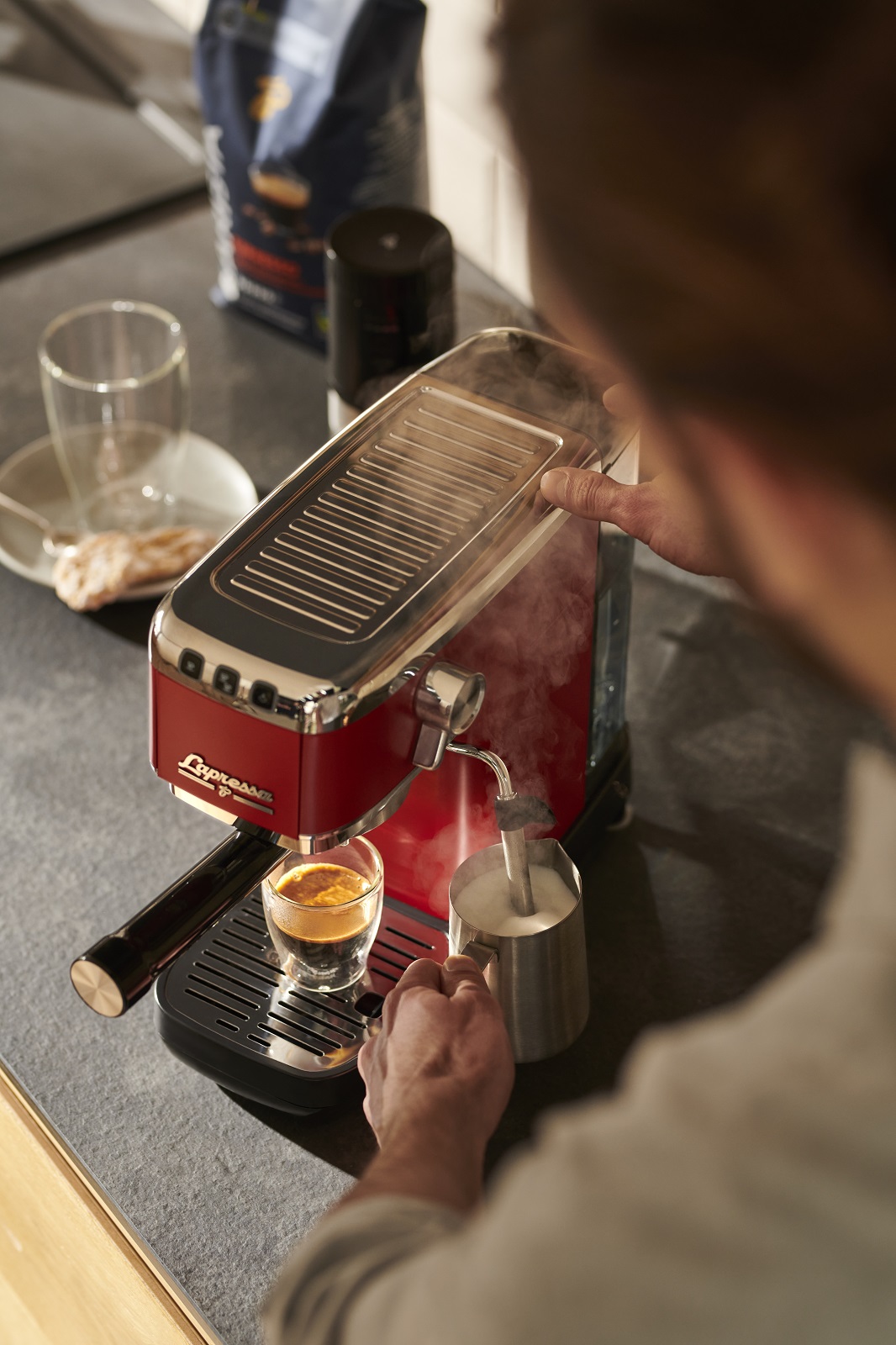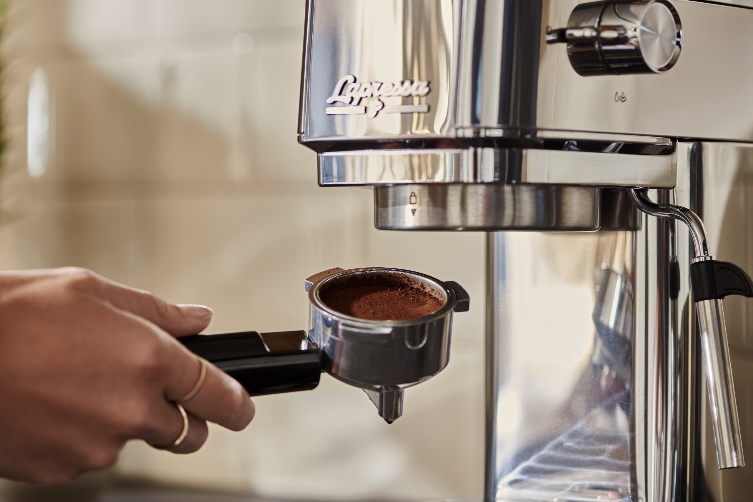 Bleibt nur die Frage nach der passenden Farbe: Die Lapressa gibt es in feurigem italienischem Rot, klassisch in Edelstahl oder in rasantem Schwarz. Wer die Espressozubereitung mit dem Siebträger zelebriert, braucht Zubehör: Ob elektrische Mühle mit integrierter Waage, Milchaufschäumkännchen aus Edelstahl, Tamper