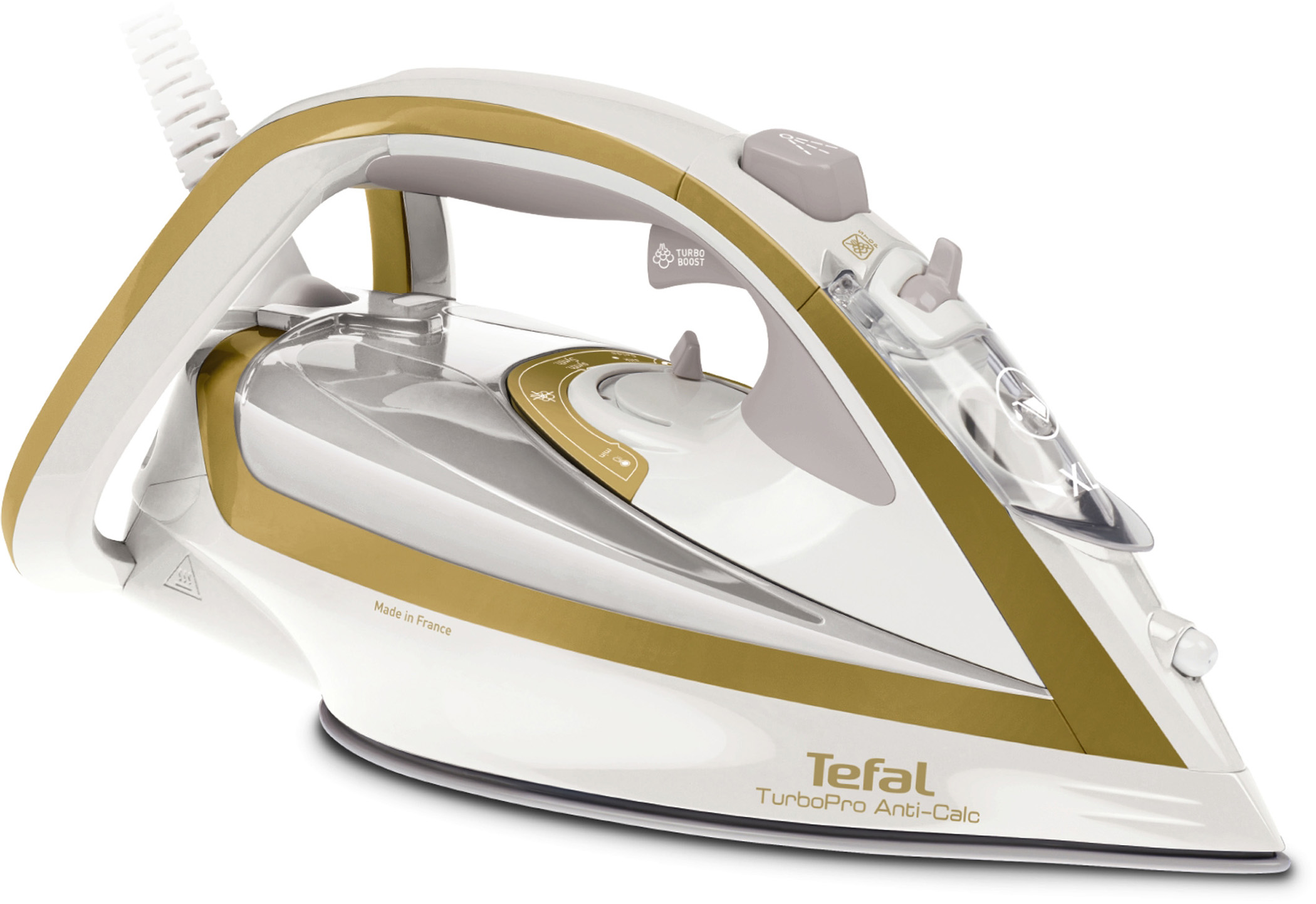 Das Tefal Dampfbügeleisen Turbo Pro FV5625 ist mit Durilium-Technologie ausgestattet. Durch die kratzfeste Sohle gleitet das Bügeleisen auch über Reißverschlüsse und Knöpfe, ohne Spuren auf der Oberfläche zu hinterlassen.