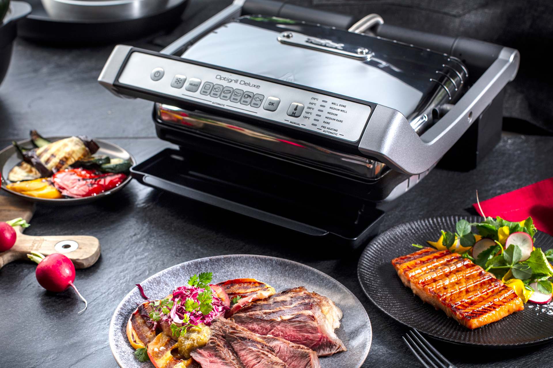 Der Tefal Grill OptiGrill Deluxe verfügt über eine Technologie, die Garzeit und -temperatur genau auf die Dicke des Fleisches und die gewünschte Beschaffenheit abstimmt. Nutzer haben die Wahl zwischen Rare, Medium Rare, Medium, Medium Well und Well Done.
