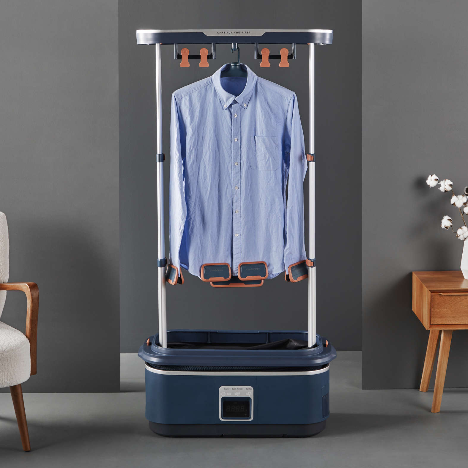 Der vollautomatische Dampfglätter Care For You First bietet drei Funktionen: Dampfglätten, schnelles Auffrischen und Desinfizieren. Dabei kommt der Dampfglätter ohne chemische Reinigungsmittel aus und nutzt die natürliche Kraft des Dampfes. Der Lieferumfang beinhaltet neben drei drehbaren Kleiderbügeln und den Klammern zum Beschweren (8x klein; 4x groß) eine Fernbedienung zur einfachen Steuerung.