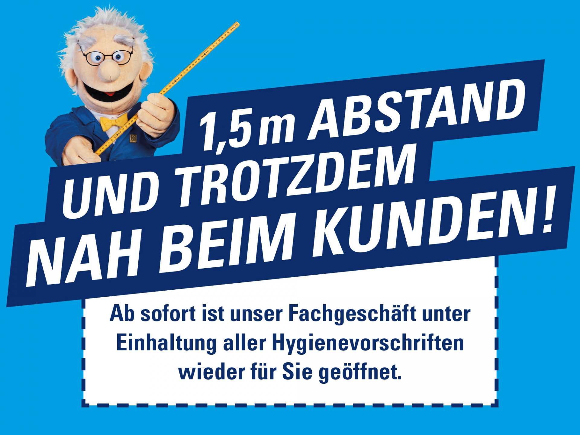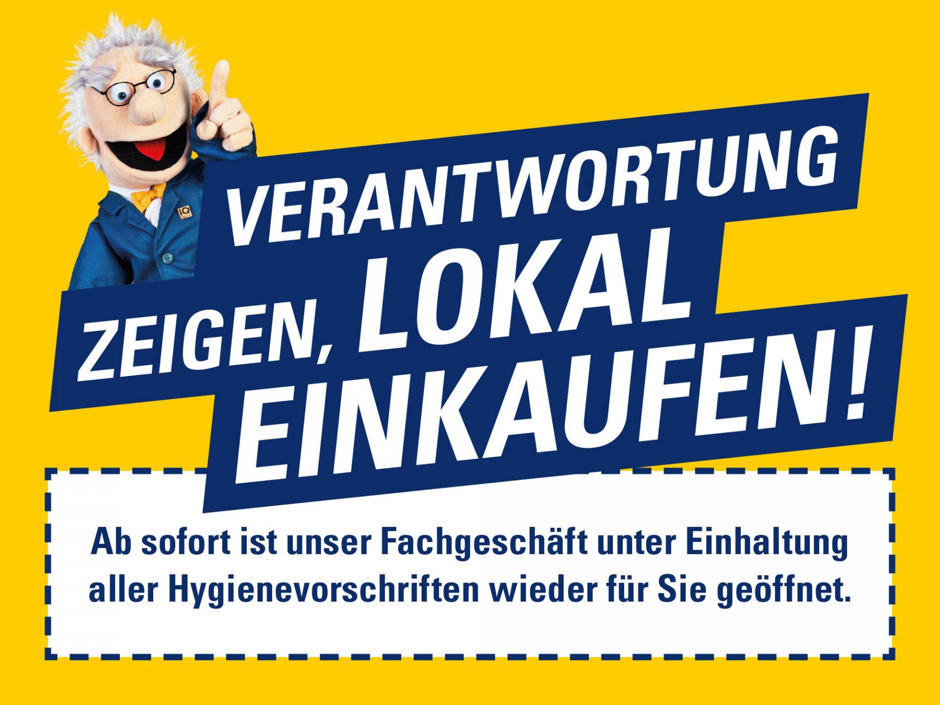 Deshalb freuen sich „die teleringer“ jetzt darüber, dass gestern in den meisten Bundesländern die kleineren Geschäfte als erste wieder öffnen durften. Für die Wiedereröffnung hat die Kooperation ihren Mitgliedern attraktive Banner für die IQ-Webseiten und Facebook-Accounts zur Verfügung gestellt. Mit knackigen Sprüchen wie „Raus aus der Bude, rein in den Laden!“ oder „1,5 m Abstand und trotzdem nah beim Kunden“ weist der rührige Professor IQ darauf hin, dass die IQ-Fachgeschäfte wieder geöffnet sind.