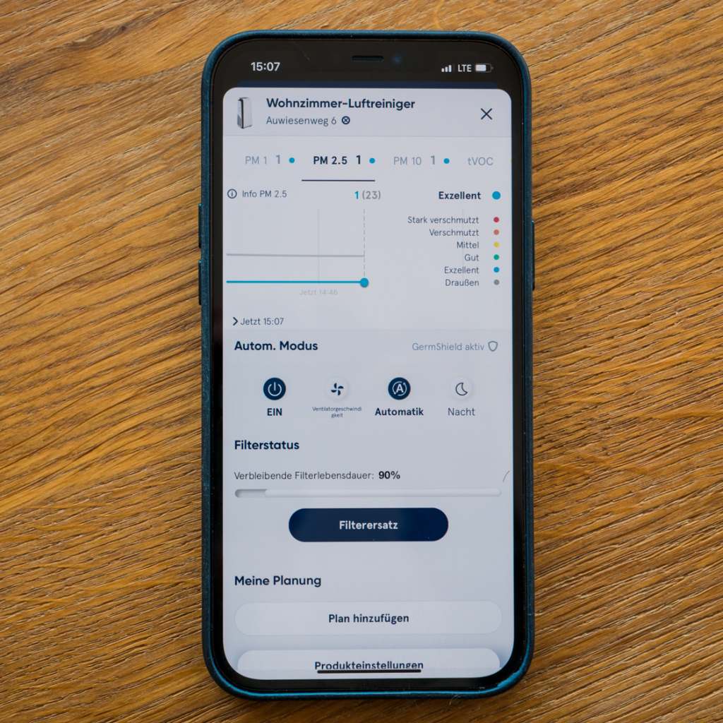 Natürlich verfügt der Blueair HealthProtect auch über eine schicke App, mit der man den Luftreiniger steuern und jederzeit die Luftqualität einsehen kann. Auch die Verknüpfung mit dem Google Assistant oder Amazon Alexa ist möglich. Im Endeffekt sind das aber alles nur nette Gimmicks. Denn durch das LED-Display, das nicht nur mit Zahlen, sondern auch mit Farben die aktuelle Luftqualität visualisiert, ist man immer auf dem Laufenden.