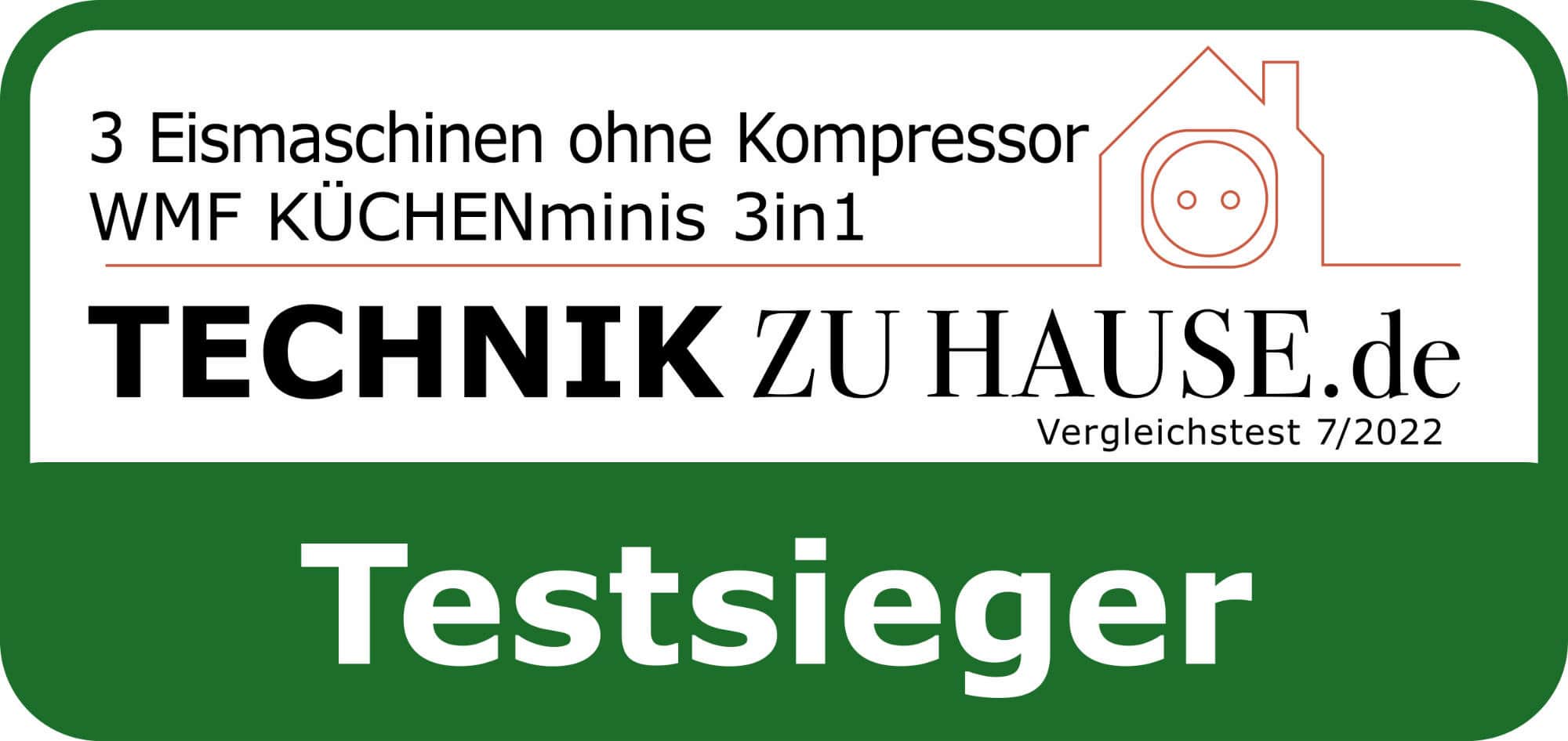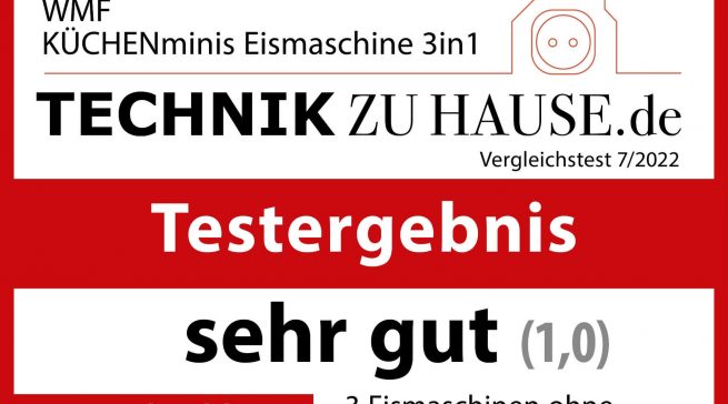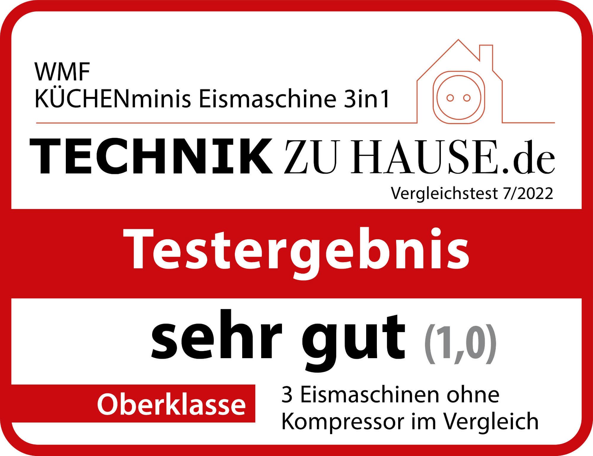 Im Fazit der Testredaktion heißt es: „Die WMF KÜCHENminis Eismaschine 3in1 ist bewusst für den kleinen Haushalt gedacht und benötigt durch ihre zylindrische Form wenig Stellfläche. Mit unsichtbar integriertem Motor ist sie besonders bedienfreundlich und von uns zum Testsieger ernannt.“
