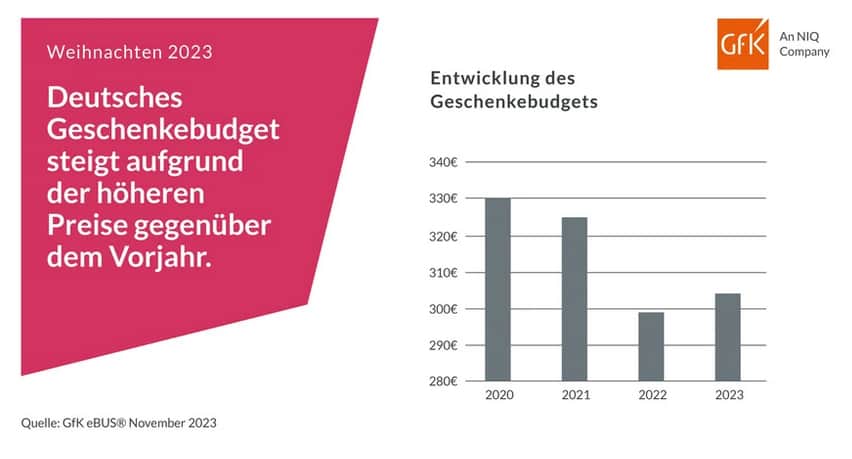 Das Budget für Weihnachtsgeschenke liegt aufgrund steigender Preise nun bei durchschnittlich 304 Euro pro Person (2022: 299 Euro) und damit deutlich niedriger als in den Pandemiejahren 2020 und 2021. Entsprechend achten 70% der Konsumenten beim Weihnachtseinkauf stärker auf den Preis. Der stationäre Einzelhandel bleibt vor den Festtagen eine wichtige Inspirationsquelle und kann sich besonders auf jüngere Käufergruppen freuen. Das sind Ergebnisse einer aktuellen GfK-Analyse zum Konsumverhalten rund um Weihnachten.