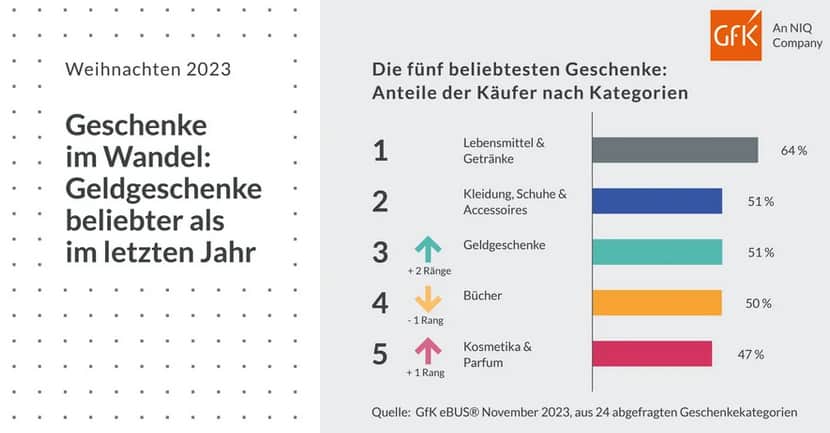 GfK erwartet in diesem Jahr im Weihnachtsgeschäft ein Umsatzvolumen von 18,1 Milliarden Euro. Das ist ein Plus von 1% gegenüber 2022. Berücksichtigt man die Preisentwicklung der letzten zwölf Monate, liegt das erwartete Weihnachtsgeschäft allerdings fast 3% unter dem des Vorjahres.