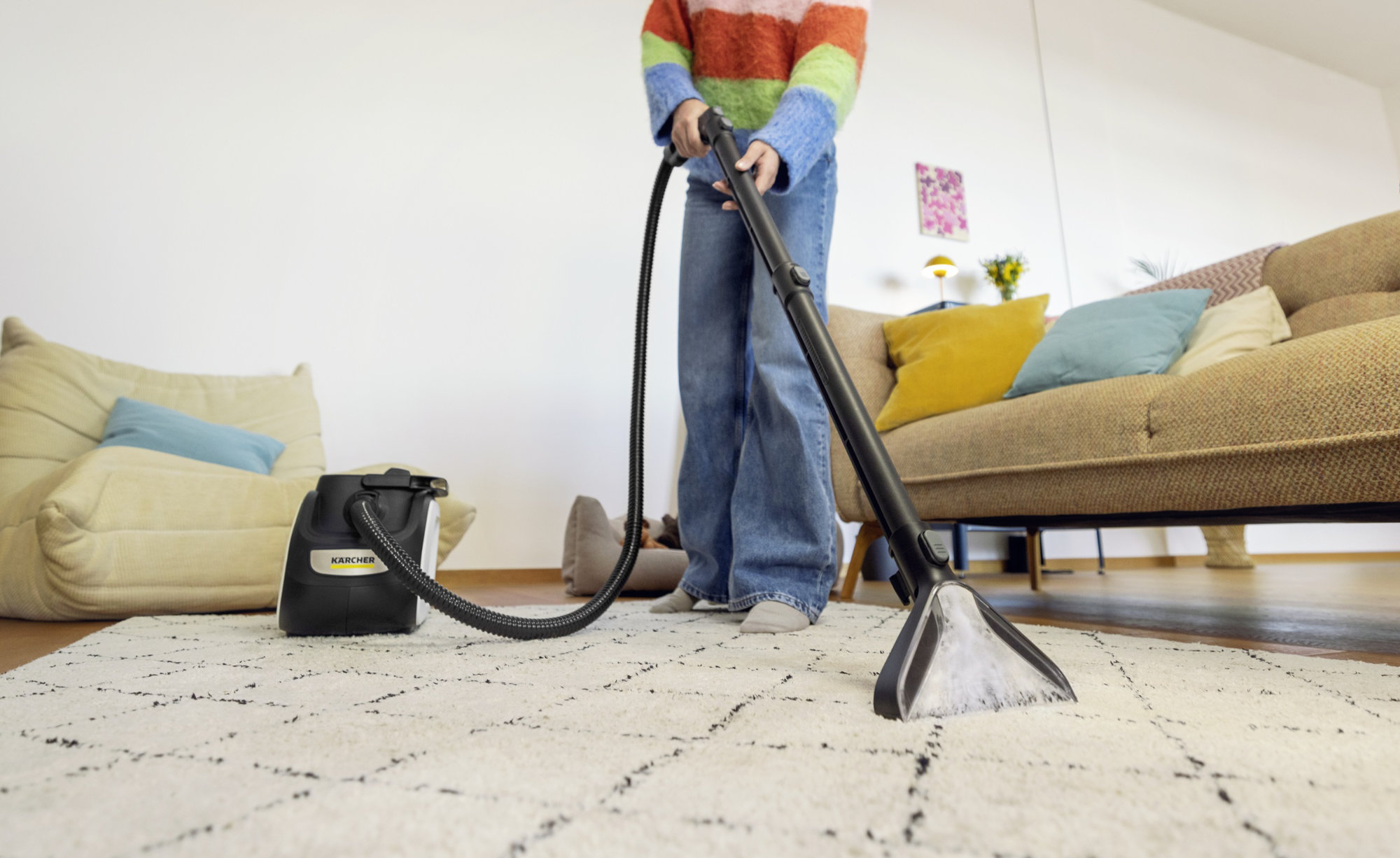Die Standardvariante enthält eine Waschdüse für Polster und eine schmale Fugendüse für enge Bereiche wie Sofaritzen. Ergänzend dazu bietet Kärcher den SE 3 Compact Home Floor speziell für die Teppichreinigung an. Mit zusätzlichem Zubehör können Anwender Teppichflächen im Stehen oder, wenn die Düse direkt am Handgriff angebracht wird, auch größere Polsterflächen in kurzer Zeit reinigen.