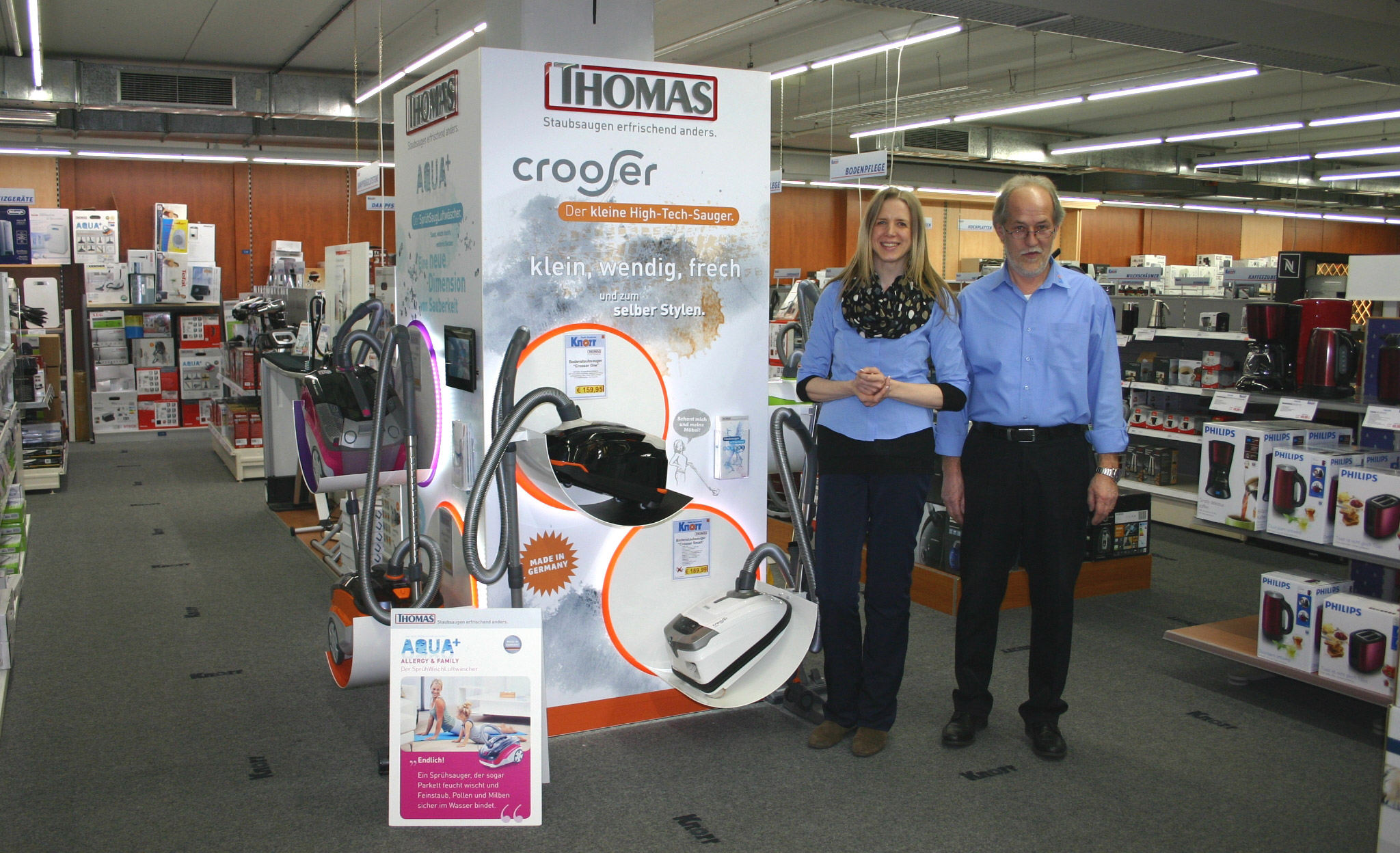 Vor fünf Monaten führte Thomas sein neues PoS-Präsentationssystem ein: hochwertig, puristisch und innovativ. Eisen Knorr in Weiden (Bayern) war einer der Ersten, der sich für das System entschieden hat. „Das neue Thomas Mobiliar hat uns auf Anhieb sehr gut gefallen. Denn wir positionieren Produkte, die uns überzeugen, natürlich gerne in einer Toplage. Deshalb haben wir das neue System prominent in die Staubsaugerpräsentation auf unserer Verkaufsfläche integriert. Das puristische Design ist ein wahrer Eyecatcher“, so Kerstin Drexler, Hauptabteilungsleiterin Hausrat, Elektro, Klein-/Großgeräte bei Eisen Knorr.