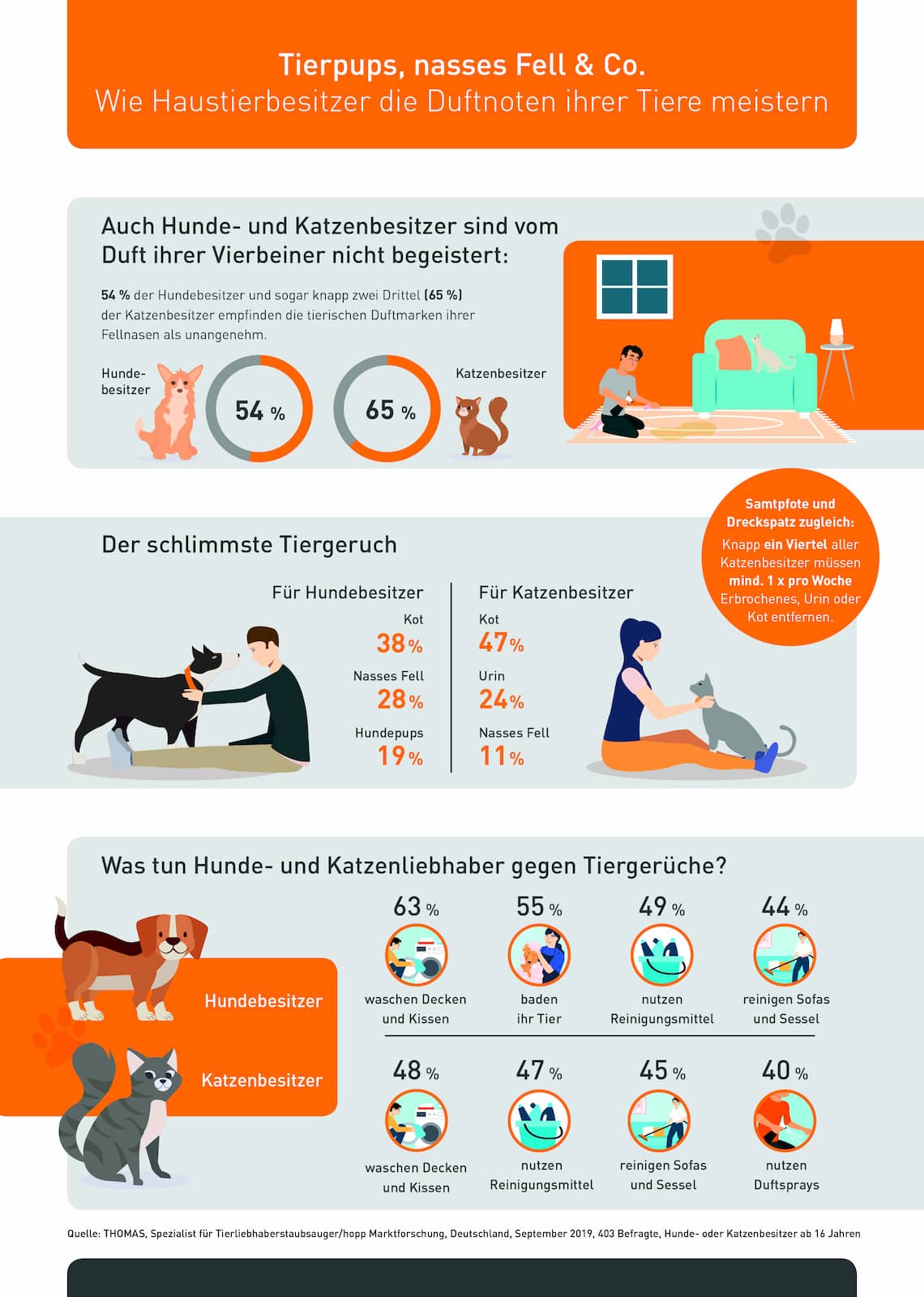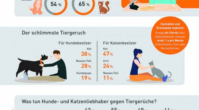 Mehr noch: Insgesamt 54 % der Hundebesitzer und sogar 65 % der Katzenbesitzer jucken die tierischen Duftnoten ihrer Fellnasen in der Nase. Welche Gerüche dabei am meisten nerven und wie Haustierbesitzer den tierischen Duftnoten zu Leibe rücken, hat Thomas, Hersteller spezieller Staubsauger für Tierliebhaber, in einer Onlinebefragung von Katzen- und Hundebesitzern herausgefunden.