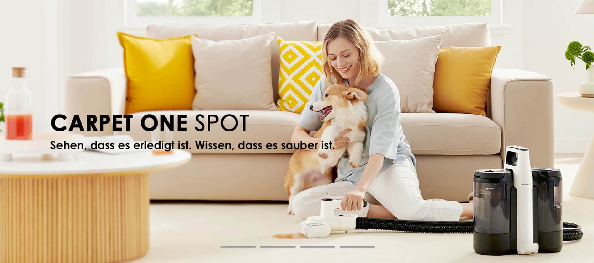 Der Carpet One ist ein kabelloser Polster- und Teppichreiniger. Mit der Spot-Modus-Funktion können Benutzer das Gerät so einstellen, dass es ohne wiederholtes Bücken oder Schrubben arbeitet. Die Tineco iLoop Smart Sensor Technology ermöglicht es, hartnäckige Flecken automatisch zu erkennen, zu schrubben und zu entfernen. Der Reiniger verfügt außerdem über eine Selbstreinigungsfunktion für Bürste und Schlauch.