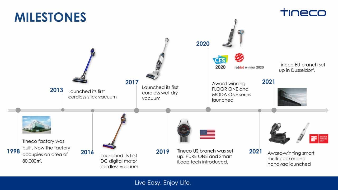 Am 13. März 2019 brachte Tineco mit dem „PURE ONE“ den allerersten intelligenten Staubsauger mit Staubsensortechnologie auf den Markt und wurde damit zu einem Vorreiter der Branche. Es folgten weitere Meilensteine, so etwa der erste intelligente Nass-Trocken-Staubsauger „FLOOR ONE“, der bald weltweite Anerkennung fand. Heute hält Tineco Hunderte von nationalen und internationalen Patenten und hat weltweit hohe Umsätze erzielt.