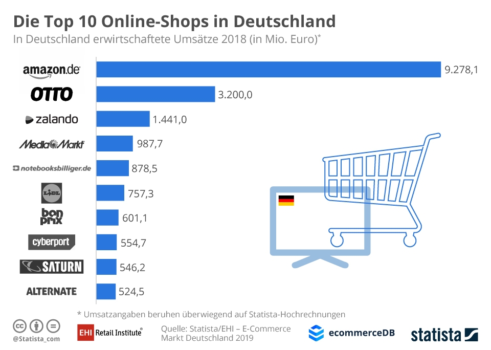 Die Infografik von Statista zeigt die Spitzengruppe. Weiterhin die Nummer 1 im Markt ist die deutsche Amazon-Seite mit fast 9,3 Milliarden Euro Umsatz im Jahr 2018. Mit weitem Abstand folgen Otto (3,2 Milliarden Euro) und Zalando (1,4 Milliarden Euro). Neu in den Top 10 ist Saturn – das Technikkaufhaus erwirtschaftete rund 546 Millionen Euro.