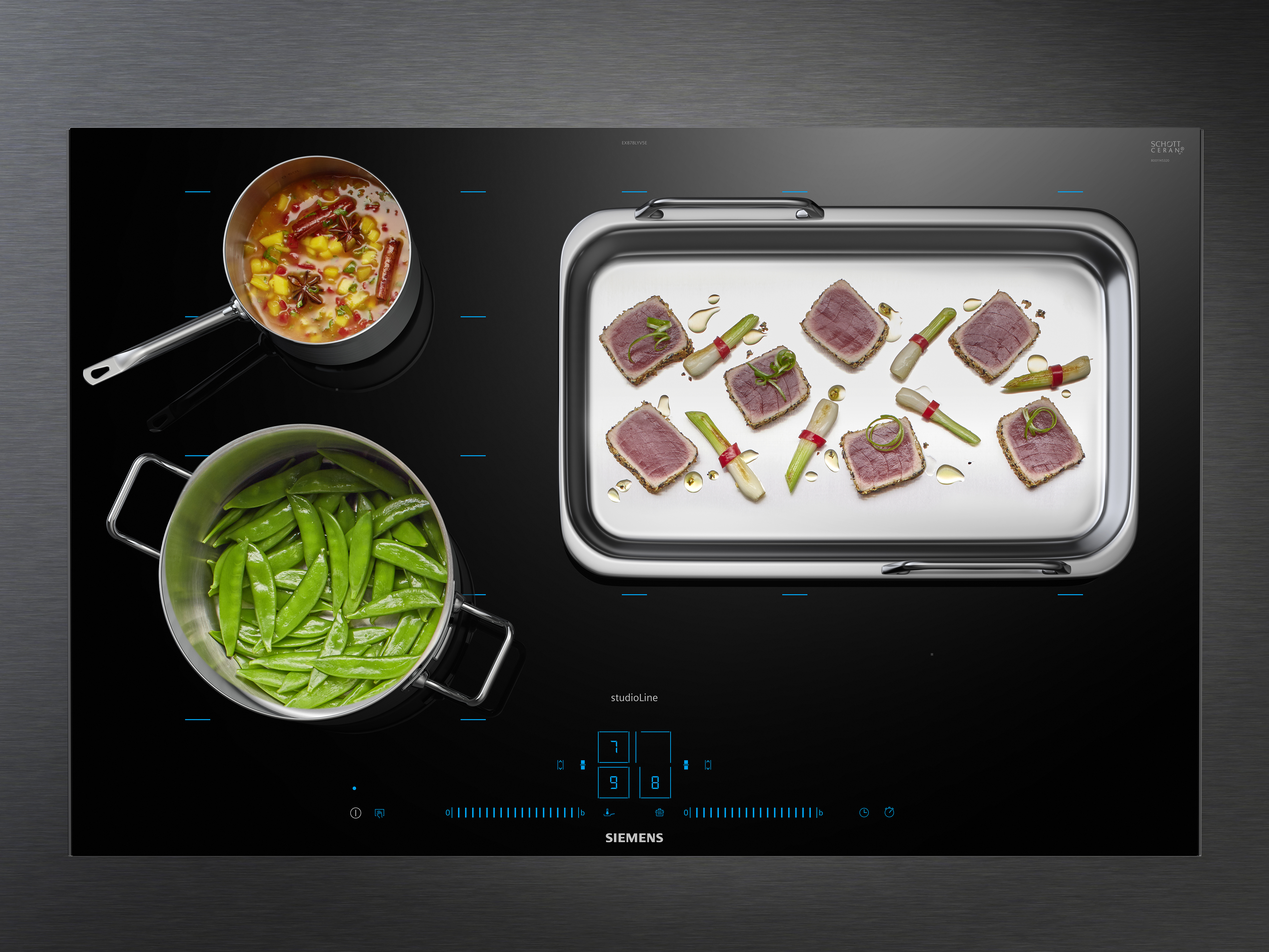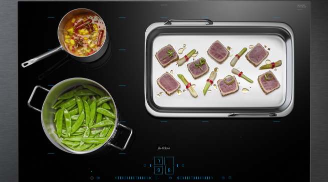 Q700 Kochfeld mit activeLight von Siemens: Das vernetzte Siemens Kochfeld mit activeLight verzichtet vollständig auf eine klassische Bedruckung zur Indikation der Kochzonen. Erst beim Kochen „erwacht“ der rein schwarze Glasscreen zum Leben und begeistert dann mit einem neuen Produkt- und Nutzungserlebnis: Das Kochfeld muss kaum mehr bedient werden. Es folgt einfach dem, was Köchin oder Koch tun.