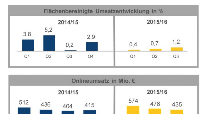 In Deutschland stieg der Umsatz im Neunmonatszeitraum 2015/16 flächenbereinigt um 2,5 %. Der berichtete Umsatz wuchs um 4,6 % auf 8,0 Mrd. Euro. Im 3. Quartal 2015/16 erhöhte sich der flächenbereinigte Umsatz um 3,8 %. Der berichtete Umsatz stieg deutlich um sogar 7,4 % und festigte die eh schon starke Marktposition in Deutschland.