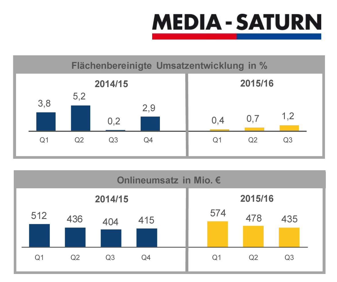 Eine Erfolgsstory ist der im Internet generierte Umsatz: Dieser legte im Neunmonatszeitraum 2015/16 um 10 % auf 1,5 Mrd. Euro zu. Auch im 3. Quartal wuchs der Internetumsatz und stieg um 7,8 % auf 0,4 Mrd. Euro. Während der Umsatz bei Redcoon aufgrund der Beendigung von ausgewähltem unprofitablem Großhandelsgeschäft weiterhin rückläufig war, konnten die Vertriebsmarken Media Markt und Saturn den Umsatz im Neunmonatszeitraum 2015/16 wie beschrieben um 34,5 % steigern. Das starke Wachstum setzte sich auch im 3. Quartal fort: Der Umsatz der beiden Vertriebsmarken wuchs deutlich um 34,7 %.