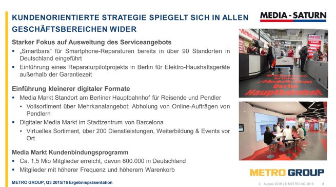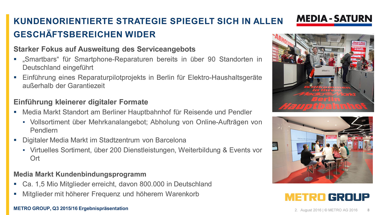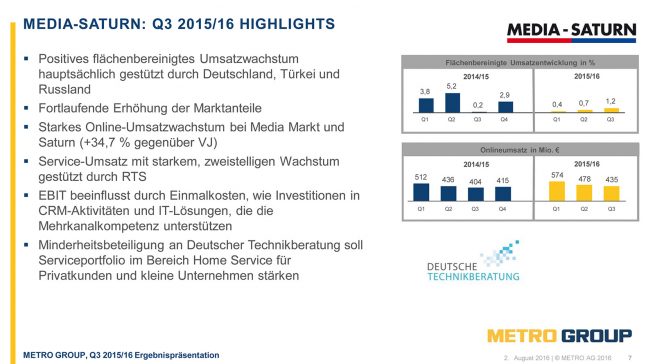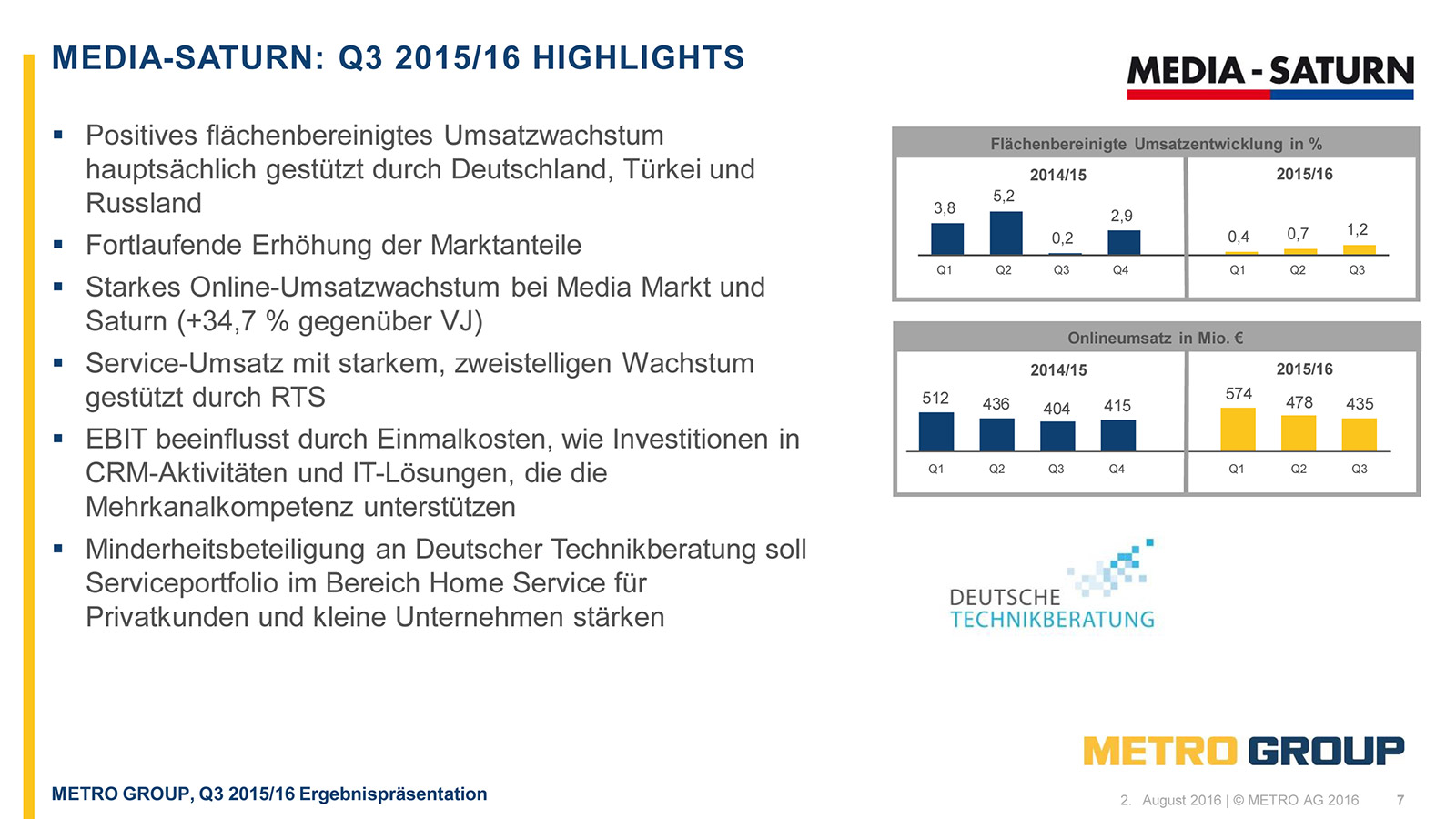 Fakt ist aber auch: Die Metro Group hat im 3. Quartal des Geschäftsjahres 2015/16 weitere Fortschritte bei der Transformation des Konzerns erzielt und erneut den Umsatz im Online- und Belieferungsgeschäft signifikant gesteigert. So wuchs der Onlineumsatz bei Media Markt und Saturn um satte 34,7 %, der Belieferungsumsatz bei Metro Cash & Carry um mehr als 15 % auf einen neuen Rekordwert von 13,3 % Umsatzanteil. Der flächenbereinigte Umsatz der Metro Group stieg im Neunmonatszeitraum um 0,2 % und lag im 3. Quartal auf dem Niveau des Vorjahresquartals. Dabei hat insbesondere Media-Saturn die positive Entwicklung der Vorquartale fortgesetzt: Die Elektronik-Sparte hat im 3. Quartal den flächenbereinigten Umsatz das 8. Quartal in Folge gesteigert.