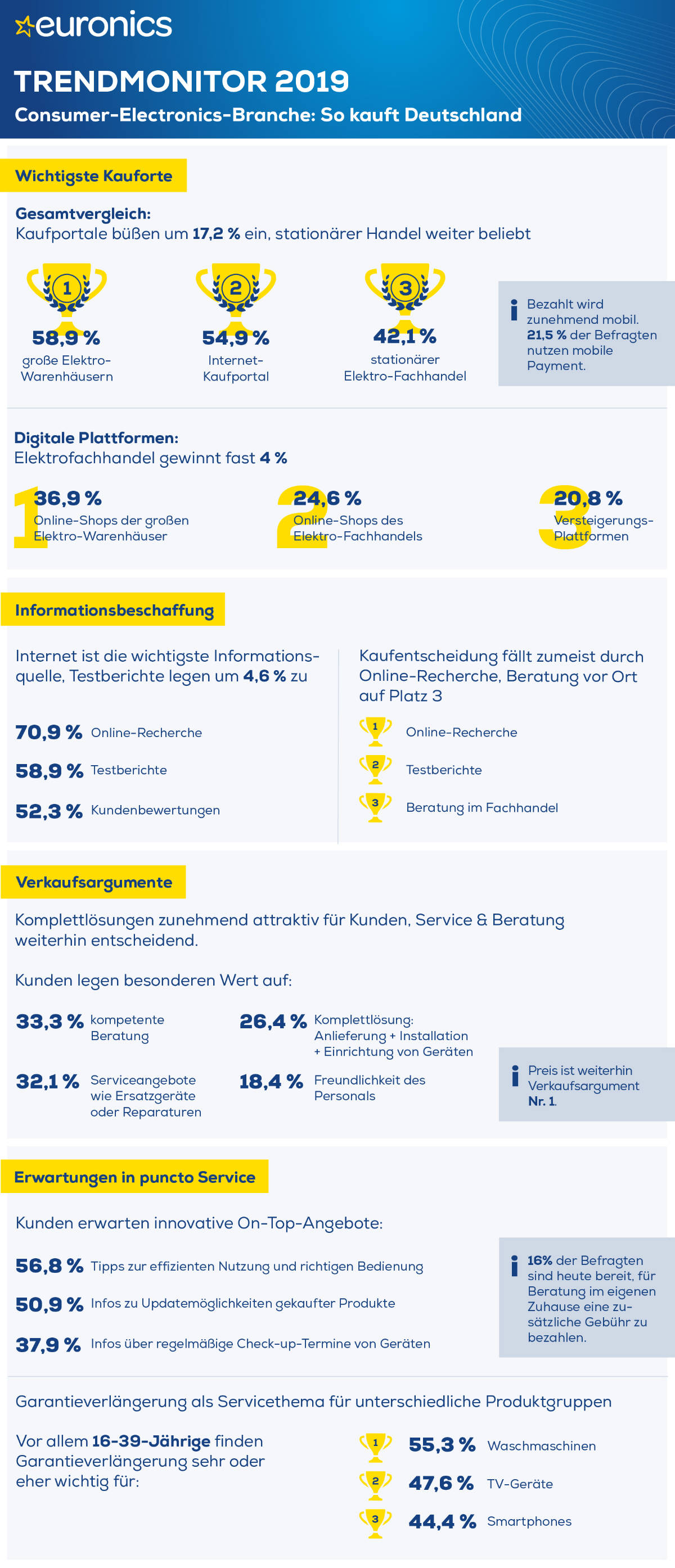 In anderen Bereichen bleiben Konsumenten in Deutschland ihrer Linie treu. Die Präferenzen beim Einkauf von Haushaltsgeräten oder Elektronik teilen sich, wie auch im Vorjahr, zu knapp 50 % in Online- und stationären Handel. 50 % gaben an, sich online oder im Geschäft zu informieren und im Anschluss stationär zu kaufen. Dabei verlassen sie sich im Zuge ihrer Kaufentscheidung auf drei Informationsquellen: generelle Onlinerecherche (35 %), Testberichte und -siegel (25 %) und Beratung sowie Empfehlungen des Fachhandels (18 % mit einer Steigerung um 4,4 Prozentpunkte im Vergleich zum Vorjahr).