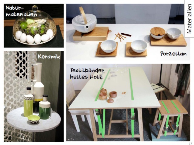 Das Thema “Fresh kitchen” zeigt, dass der Boom zur gesunden Ernährung auch Einfluss auf unsere Farbwelten und Produktaussagen für unsere Wohnräume hat. Je technischer und virtueller es um uns herum wird, desto mehr sehnen wir uns nach Romantik und Poesie. Wohnen soll Spaß machen wie beim Trend “Happy City”. Andere wünschen sich eine Oase der Stille und Ruhe daheim, da es um sie herum den ganzen Tag schon stressig genug ist. Leise subtile Farben, die an Meeresgeflüster erinnern, geben Raum zum Abschalten. Wie reisen bei unseren globalen Eroberungen nicht nur an die glitzernden Meere dieser Welt, sondern erkunden auch die heißen Wüsten. Dort finden wir neben warmen Sandtönen auch elegante Naturoptiken bei “Desert de Luxe”. Je mehr uns, vor allem in den Städten, das natürliche Erleben verloren geht, desto mehr sehnen wir uns nach ursprünglicher Natur. Sagt zumindest Gabriela Kaiser.