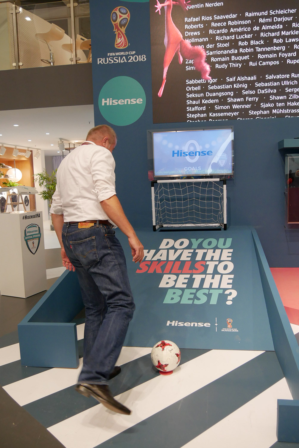 Hisense ist im kommenden Jahr offizieller Sponsor der FIFA Fussball Weltmeisterschaft in Russland. Bereits auf der IFA wurde dieses sportliche Engagement deutlich herausgestellt. Fußballerisches Können der Standbesucher wurden mit attraktiven Preisen belohnt.