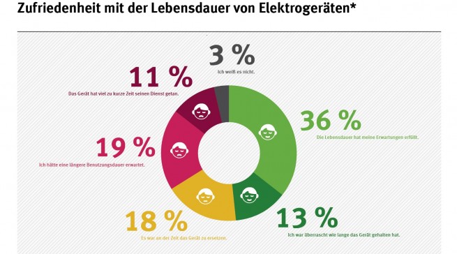 Die Gründe für einen frühzeitigen Neukauf von Elektrogeräten sind vielfältig. Gerade im Bereich der Unterhaltungselektronik sind Technologiesprünge häufig Auslöser für den Neukauf. Selbst bei Haushaltsgroßgeräten wie Kühlschränken ist bei einem Drittel der für die Studie Befragten der Wunsch nach einem besseren Gerät ausschlaggebend. Gleichzeitig stieg allerdings auch der Anteil der Haushaltsgroßgeräte, die aufgrund eines Defekts bereits innerhalb der ersten fünf Jahre ersetzt wurden: von 3,5 % im Jahr 2004 auf 8,3 % im Jahr 2013. Eine Verbraucherbefragung im Rahmen der Studie zeigt, dass rund ein Drittel der Befragten unzufrieden mit der Lebensdauer der Produkte waren.