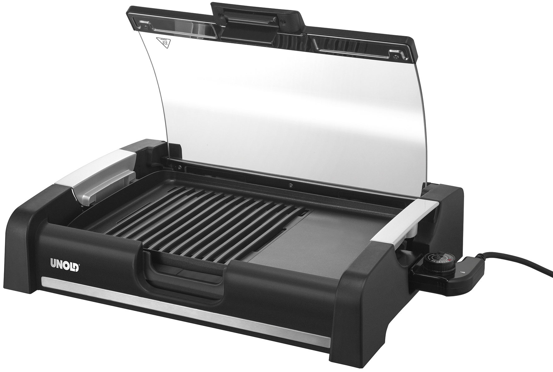 Der Unold BARBECUE-GRILL Edel ist ein eleganter Tischgrill mit abnehmbarem Glasdeckel, der wegen seiner keramisch-antihaftbeschichteten Grillplatten schnell und einfach zu reinigen ist. Das ganze Jahr über, unabhängig von Wind und Wetter, drinnen oder draußen. Mit dem Unold BARBECUE-GRILL Edel kann man jederzeit an jedem Ort leckere BBQ´s genießen. Der abnehmbare Glasdeckel kann sowohl als Spritzschutz, wie auch als Windschutz, beispielsweise auf dem Balkon, der Terrasse, oder auch im Garten, genutzt werden.