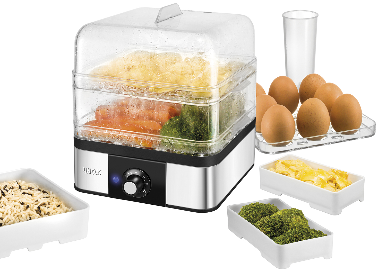 Der Unold Dampfgarer Mini Allround werden Gemüse, Fleisch und Fisch schonend und gesund gegart. Dabei bleiben wertvolle Vitamine und Mineralstoffe in den Lebensmitteln enthalten. Mit einem Volumen von ca. 4 Liter lässt sich ein ganzes Menü garen. Die stufenlose, elektronische Garzeitregelung, die Abschaltautomatik und der Signalton bei Erreichen der gewünschten Garzeit sorgen für das richtige Garergebnis.