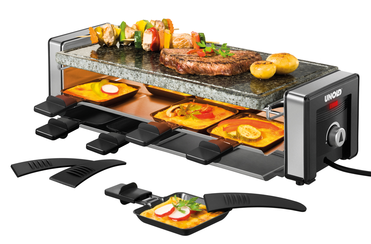 Das Unold Délice Raclette bietet Platz für insgesamt acht antihaftbeschichtete Raclette-Pfännchen. Eine 40 x 20 Zentimeter große Naturstein-Grillplatte deckt das Heizelement nach oben hin ab und ermöglicht so gleichzeitiges Raclettieren und Grillen. Die dafür nötige Hitze entwickelt das 1.100 Watt starke Edelstahl-Heizelement.