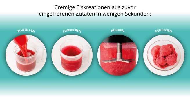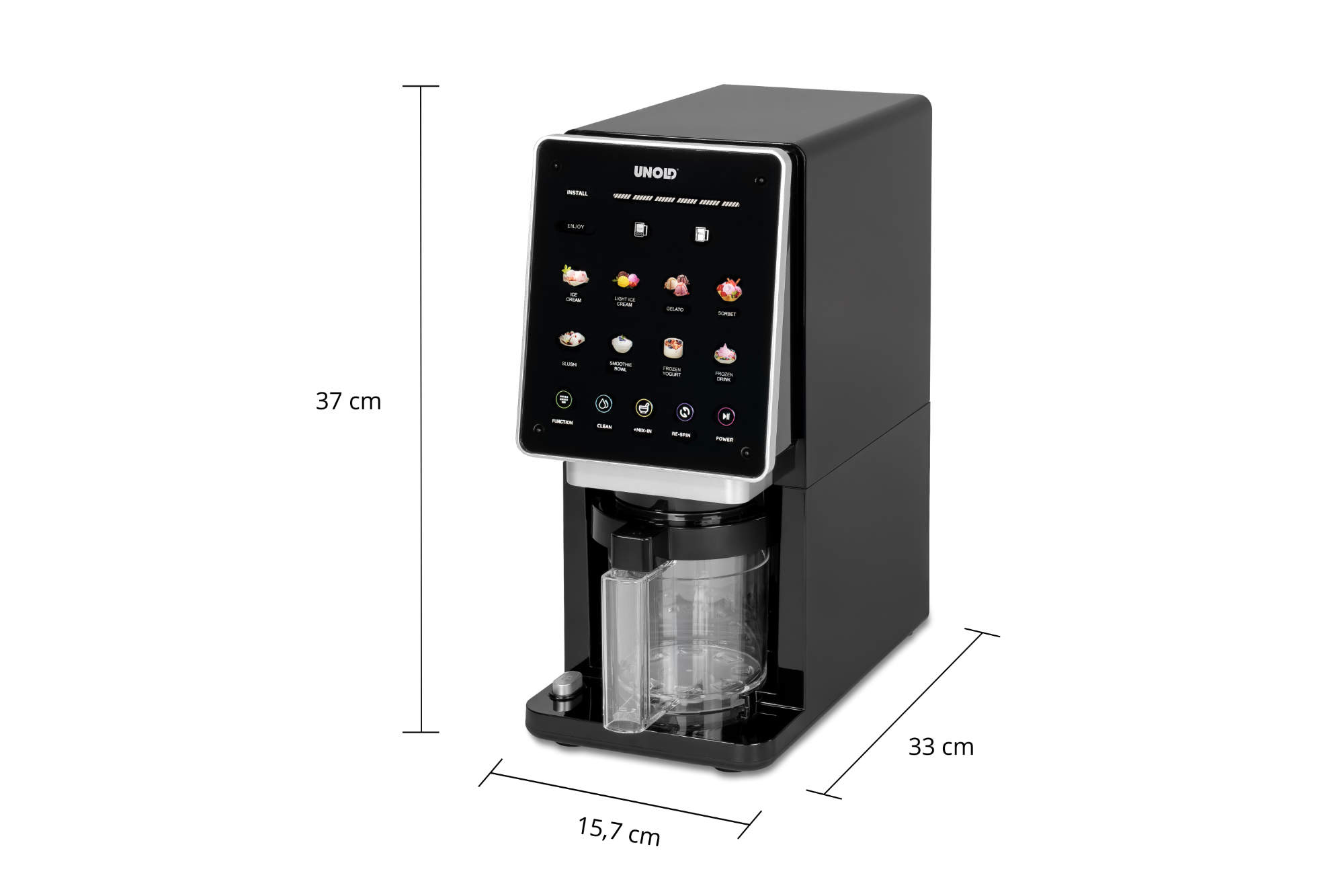 Die Bedienung erfolgt komfortabel über den intuitiven Touchscreen, auf dem Programme und Funktionen schnell auswählbar sind. Die Zubereitung ist denkbar einfach: Zutaten in den Behälter geben, 24 Stunden einfrieren, gewünschtes Programm starten – und genießen.