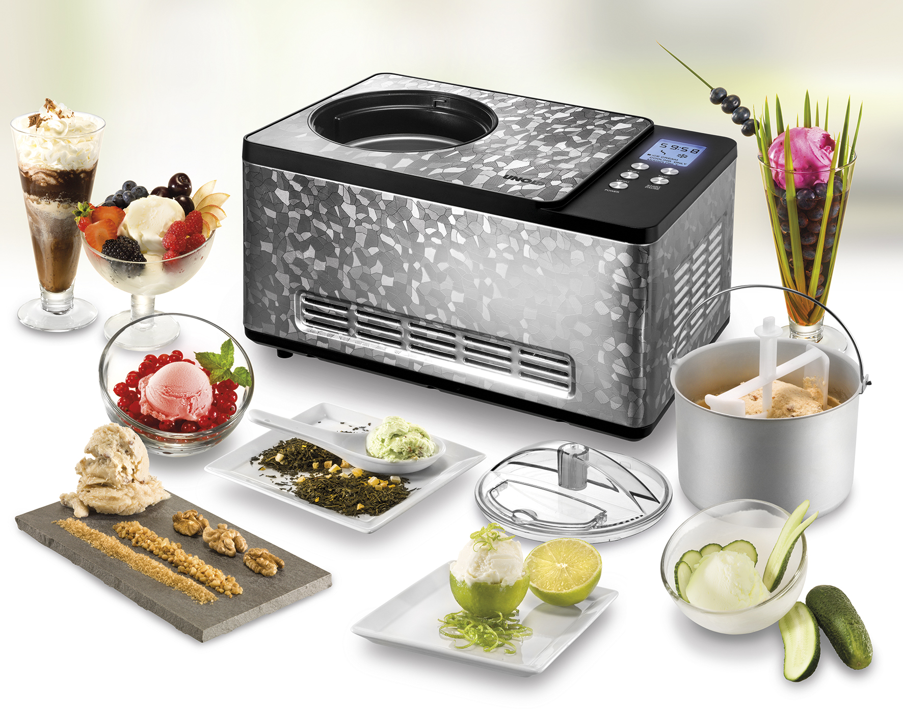 Die Unold Eismaschine Limited Edition im eleganten Edelstahl-Mosaik-Gehäuse besitzt einen äußerst robusten Motor, der mit 150 Watt betrieben wird und deshalb auch für den Dauerbetrieb geeignet ist. Der selbstkühlende Kompressor sorgt mit einem Gefrierbereich bis zu -35°C für die richtige Temperatur, somit ist kein Vorgefrieren des entnehmbaren Eisbehälters im Gefrierfach mehr nötig. Welche Eiskonsistenz erreicht werden soll, lässt sich über das große LCD-Display programmieren.