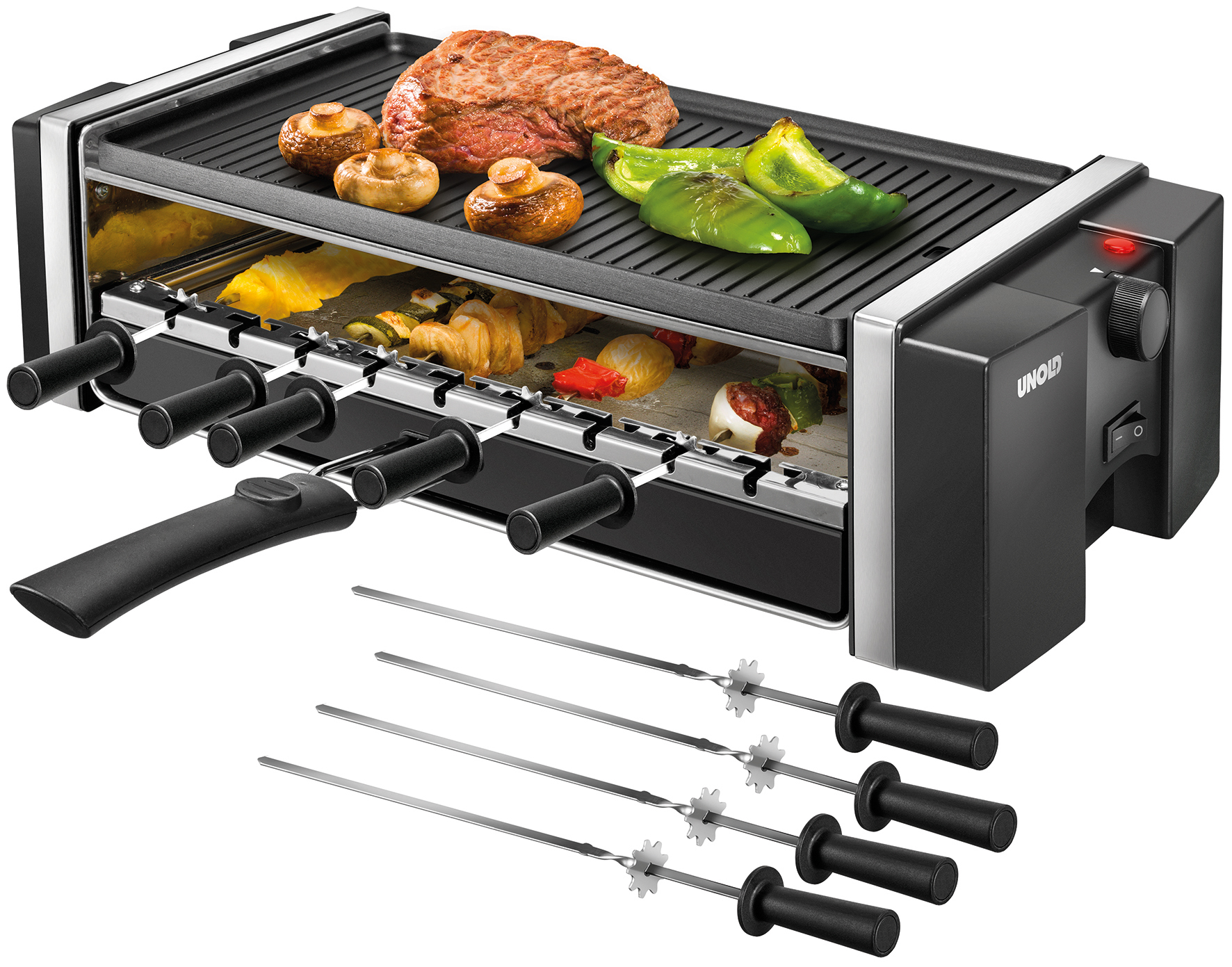 Der Unold Grill & Kebab ist ein Grill mit Grillplatte und neun Drehspießen. Auf der besonders großen, wendbaren Grillfläche mit stufenloser Temperaturregelung gelingt das Grillgut einfach perfekt. Gleichzeitig bieten die 9 Fleisch-, Fisch- und Gemüsespieße Grillgenuss für jeden Geschmack. Durch die zuschaltbare Rotation werden die Spieße gleichmäßig gegrillt. Die Spieße lassen sich auch für Obst- und Fruchtspieße verwenden. Grillplatte, Fettauffangschale und Spieße sind spülmaschinengeeignet.