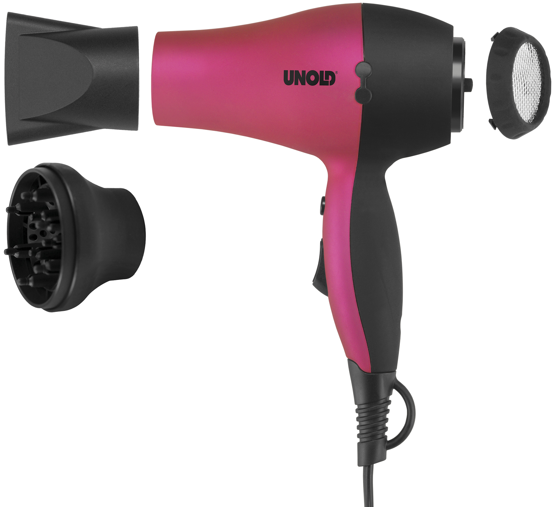 Der Unold Haartrockner Fashion ist klein, stark und pink-schwarz. Zwei Geschwindigkeitsstufen erzeugen einen optimalen Luftstrom, mit dem der Unold Haartrockner Fashion schnell modische Frisuren zaubert. Zur Ausstattung gehören eine Ondulierdüse, die Haarsträhnen ganz präzise trocknet und ein Diffusor für mehr Volumen im Haar. Zusätzlichen Komfort bietet die Cool-Air-Kühlstufe. Die intensive Kaltluft fixiert das Styling und sorgt so für natürlich längeren Halt. Außerdem ist der Unold Haartrockner Fashion kompakt, handlich und klein genug, um in jeder Sporttasche ein Plätzchen zu finden.