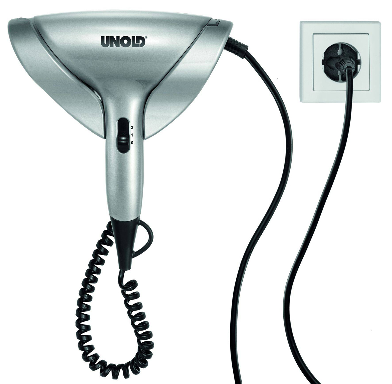 Der Unold Haartrockner Wall wird an der Wand mit dem dazu passenden Wandhalter befestigt. Darin ist auch eine Steckdose integriert. Mit 1.600 bis 1.800 Watt und zwei Geschwindigkeitsstufen macht der DC-Pro Motor dem Haartrockner richtig Dampf. Für Kühle sorgt die Cool-Air-Kühlstufe. Wird der Unold Haartrockner Wall nach Gebrauch in die Wandhalterung gehängt, schaltet er sich automatisch ab.