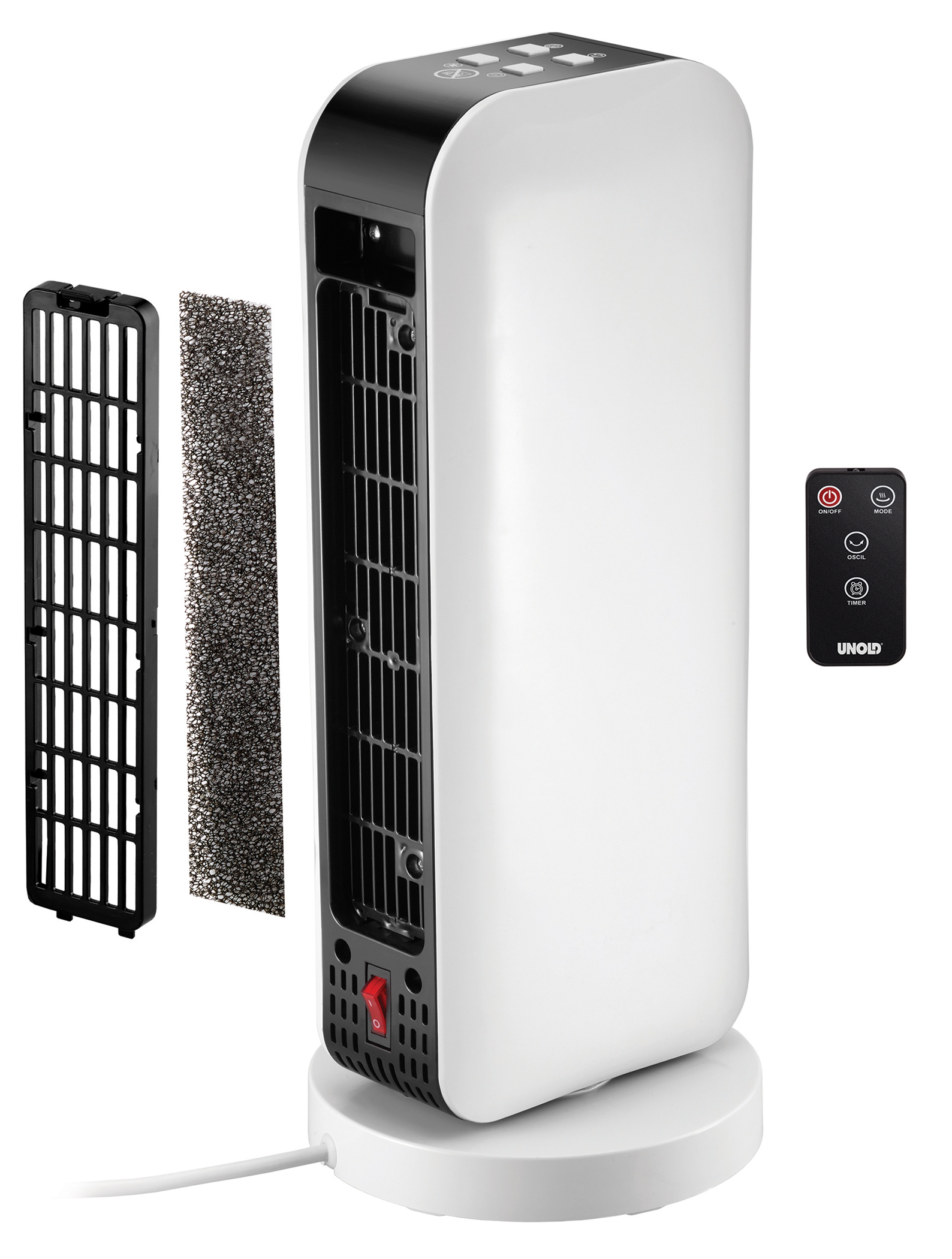 Der Unold Heizlüfter Design verfügt über ein 4 Stufen Keramik-Heizelement mit den Funktionen Aus, Ventilation, Warm- und Heißluft. Bei voreingestellter, erreichter Temperatur schaltet sich das Gerät automatisch ab.