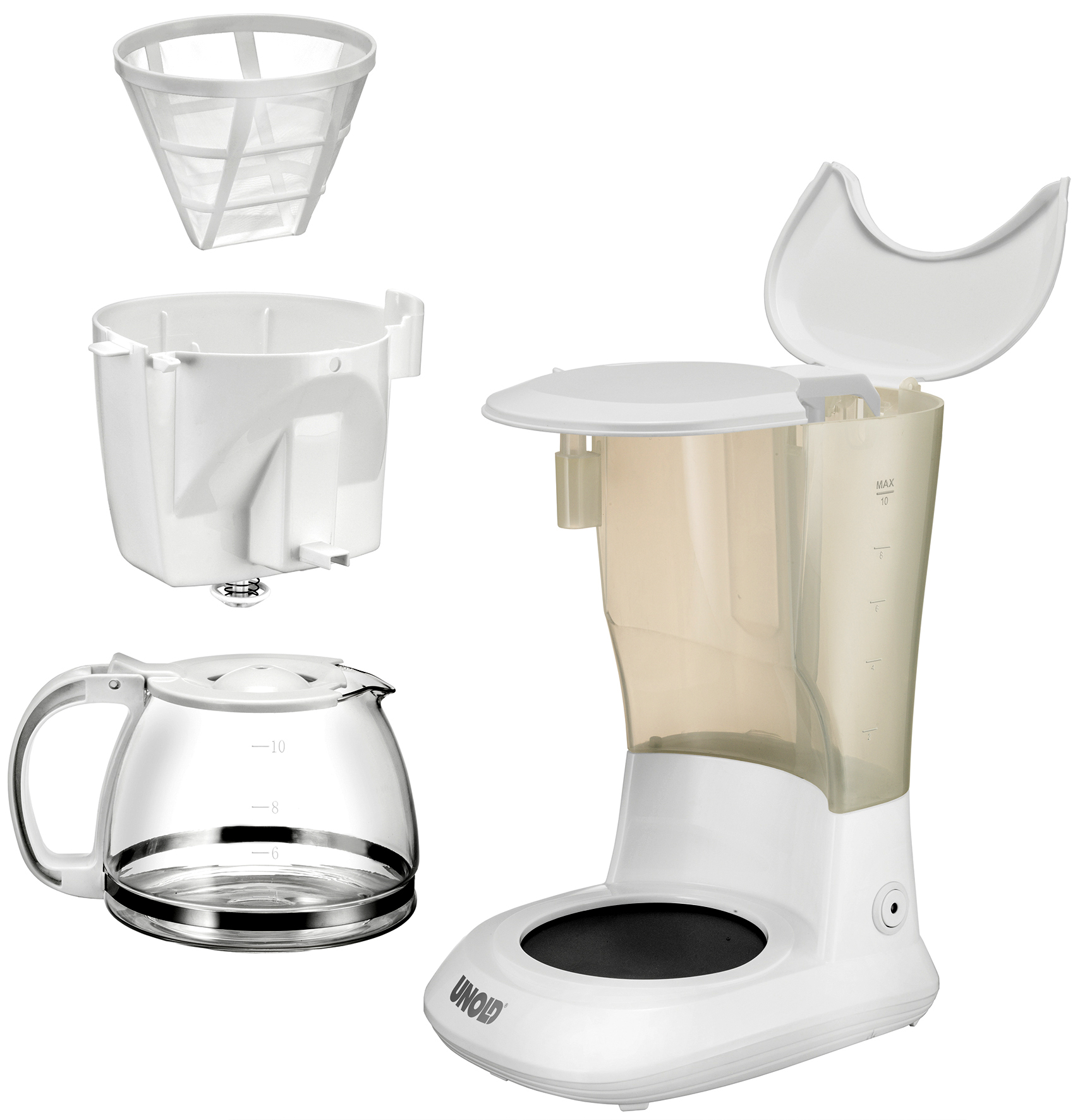 Die Unold Kaffeemaschine Flavor bereitet klassischen Filterkaffee. Der praktische Dauerfilter erspart die Papierfilter. Die Glaskanne (1,2 Liter) mit Tassenangabe reicht für zehn Tassen. Zu den praktischen Details gehören der Schwenkfilter mit Tropfstopp, der entnehmbare Filterhalter, die beschichtete Warmhalteplatte und die Füllstandsanzeige.