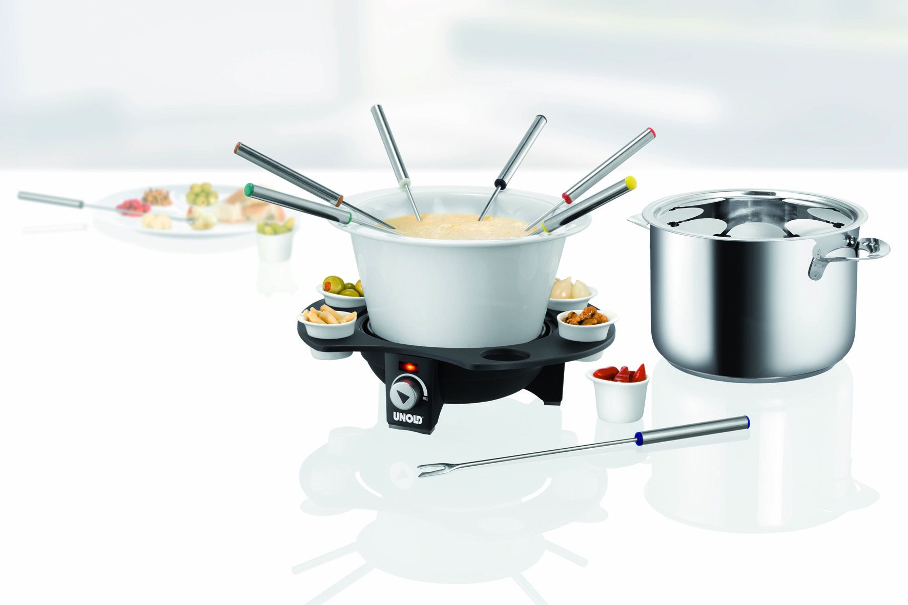 Das „Raclette délice“ punktet mit zwei Grillplatten, die je nach Bedarf ausgetauscht werden können. So kann wahlweise auf einer Natursteinplatte oder auf einer antihaftbeschichteten Wendeplatte mit Crêpe-Vertiefung gegart, gebacken und gegrillt werden. Ein Thermostat überwacht die eingestellte Temperatur, die Seitenteile sind hitzeisoliert. Das „Fondue élégance“ wird mit separatem Keramiktopf geliefert. So kann es neben dem klassischen Fleich-Fondue auch für Käse- und Schokoladen-Fondue zum Einsatz kommen. Wer es lieber klassisch mag: Der Edelstahltopf ist mit Spritzschutz und Gabelhalterung ausgestattet.