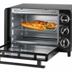 Für Energieersparnis sorgen die doppelverglaste Tür und das hitzeisolierte Außengehäuse. Kochplatten und Ofen können zeitgleich genutzt werden. Der Ofeninnenraum bietet Platz für ca. 25 cm-Back- oder Pizzaformen, die Kochplatten haben ca. 18,5 und 14,5 cm Durchmesser. Ober-/Unterhitze können zusammen oder separat eingestellt werden. Das Zubehör umfasst Grillrost und -heber sowie Backblech, einen Drehspieß nebst Halterklammer für Grillhähnchen & Co. Rezepte serviert die Bedienungsanleitung.