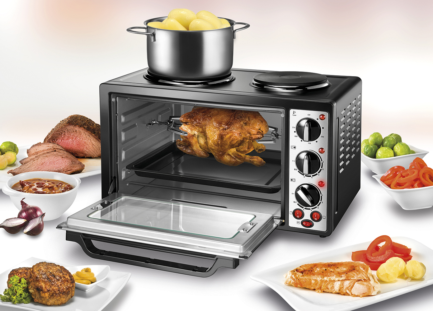 Per Timer ist der Kochautomat bis zu 60 Minuten einstellbar, das akustische Signal kündigt „Fertig“ an. Die Temperatur ist von 100° C bis 230° C einstellbar. Ober- und Unterhitze sind gleichzeitig oder separat einstellbar.