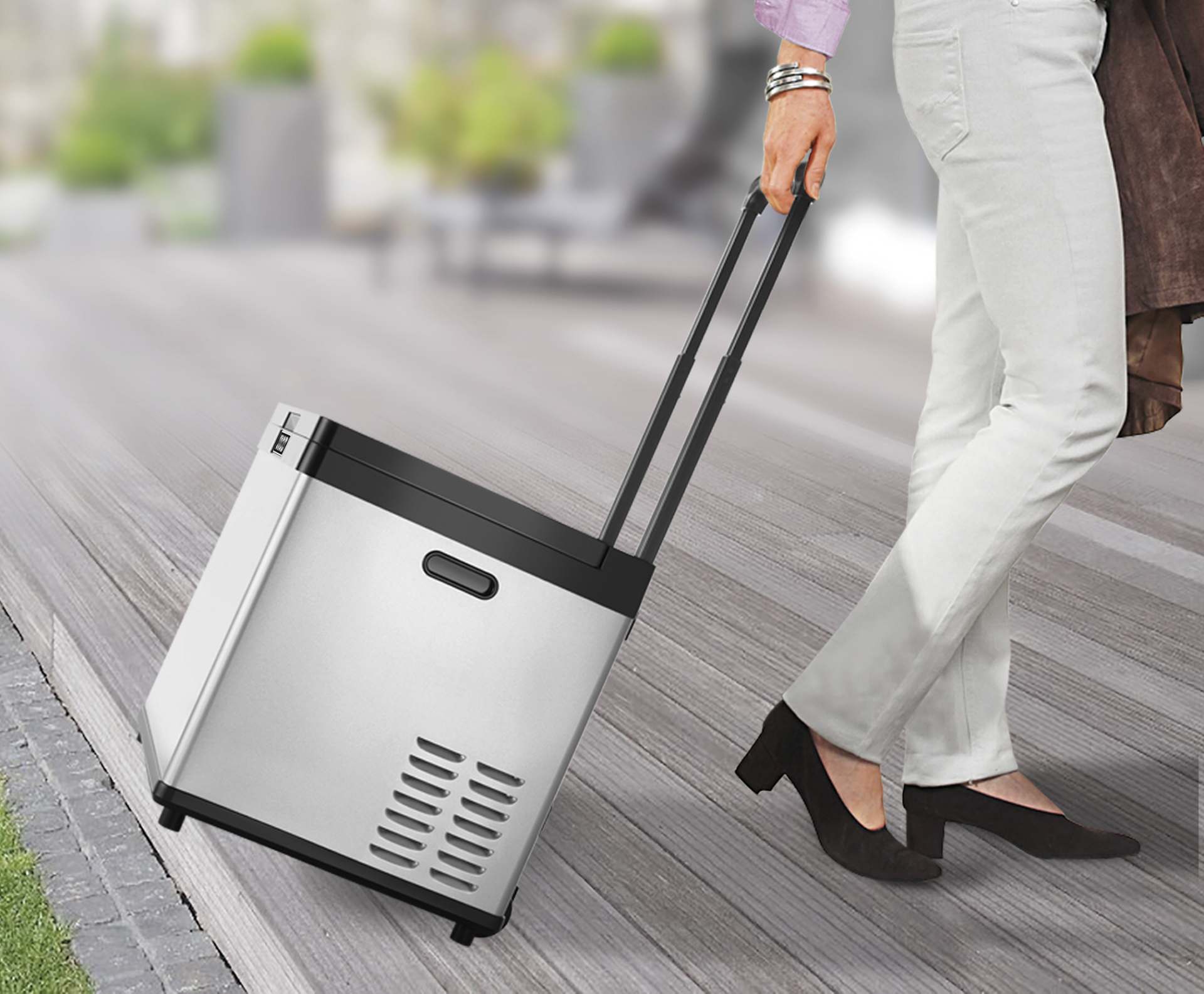 So funktioniert die Box via Zigarettenanzünder im Pkw und LKW, im Boot oder Campingbus, aber auch stationär auf Balkon und Terrasse. Der Temperaturbereich von circa +20°C bis -18°C ist einstellbar über die digitale Anzeige. Durch die ausziehbare Teleskopstange mit handlichem Griff und zwei Rollen lässt sich das Gerät bequem transportieren – wie ein klassischer Trolley.