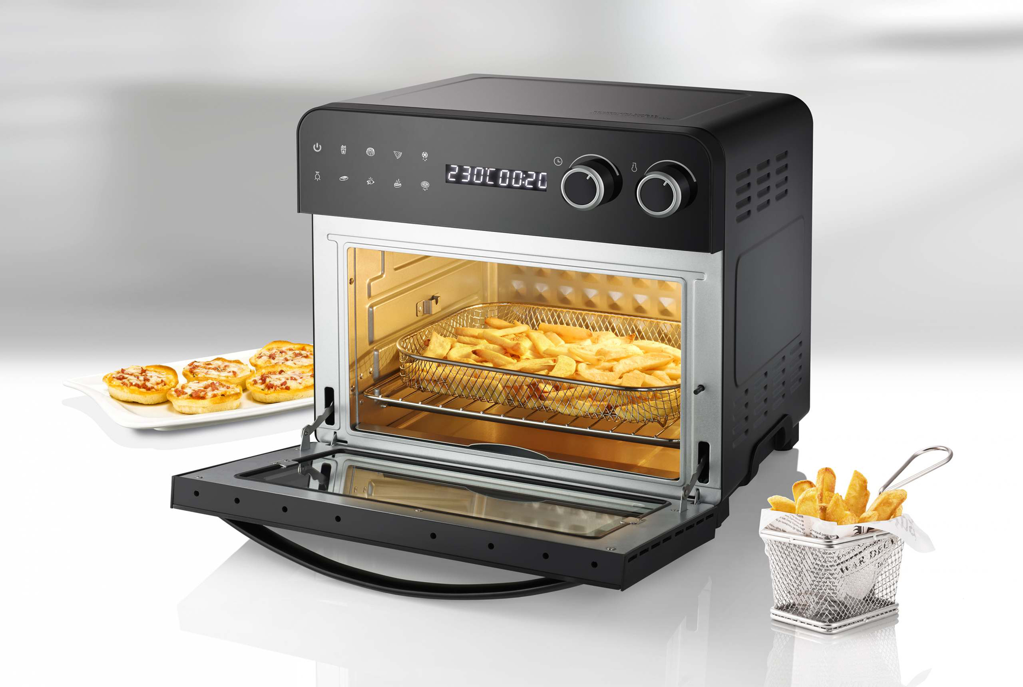 Im Backraum des Ofens finden auch große Pizzen bis zu ca. 26 cm Platz. Touchscreen-Bedienfeld, LED-Display für Temperatur und Zeit, Timer-Funktion (1 bis 5 Stunden), großes Glas-Sichtfenster und Innenraum-Beleuchtung sind Standard.