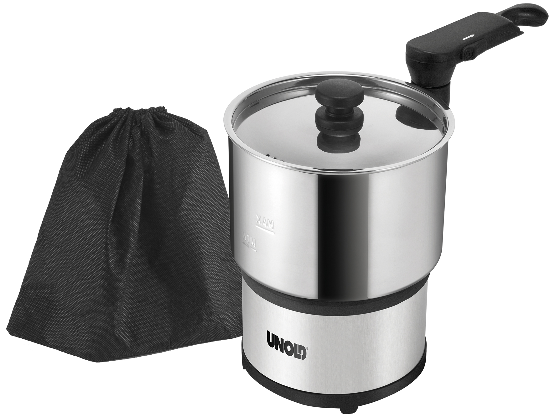 Der Unold Reise-Kocher Hot Pot versorgt Weltenbummler im Hotelzimmer, in der Ferienwohnung oder auf dem Campingplatz schnell mit kleinen Gerichten. Er ist umschaltbar von 230 V~ auf 115 V~ und passt sich so flexibel an den Gegebenheiten vor Ort an. Eins, zwei, drei – fertig ist ein Ei, oder ein paar Nudeln, oder ein Eintopf… 600 ml Flüssigkeit können im Reise-Kocher problemlos erhitzt werden, weshalb der Reisekocher auch bei einem größeren Menü zu Hause als Kochtopf für die Zubereitung von zum Beispiel Saucen ergänzt werden kann.