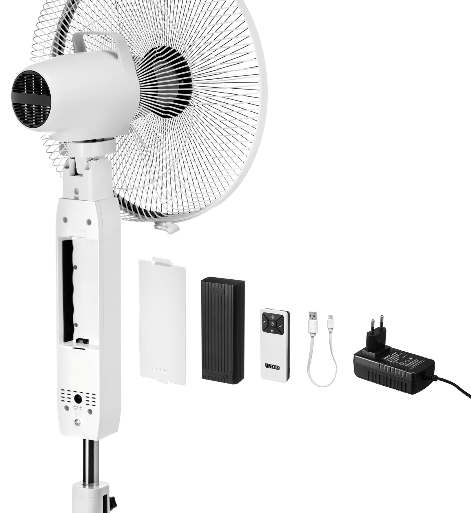 6 verschiedene Geschwindigkeitsstufen bieten die passende Luftzufuhr, die mittels Fernbedienung eingestellt werden kann. Die Fernsteuerung hält durch Magnetismus an der Akkubox. Weitere Extras, wie die LED-Leuchten, der verstellbare Neigungswinkel und die zuschaltbare Oszillation runden die Ausstattung des Unold Standventilator Akku ab.