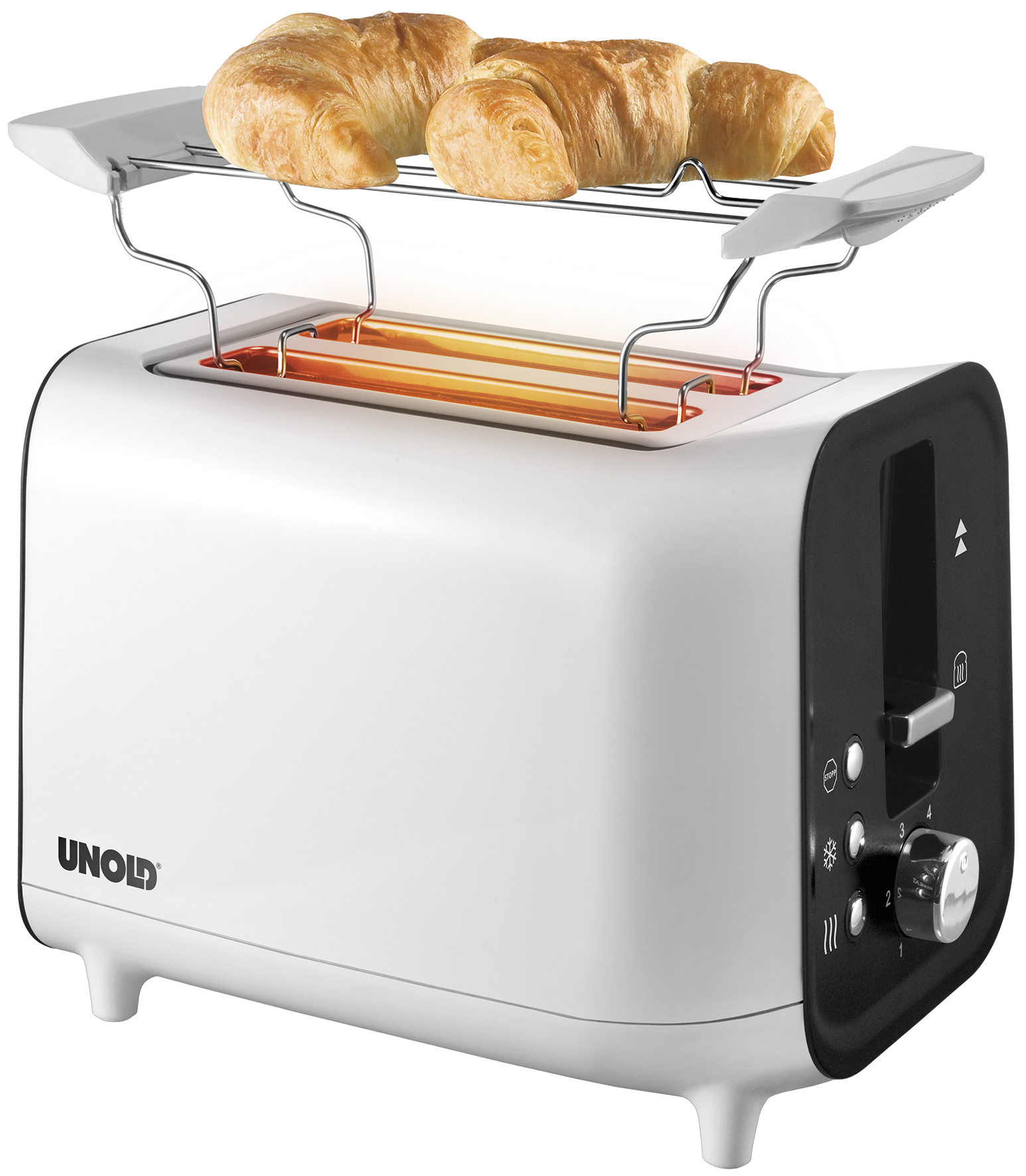 Der Unold Toaster Shine White, ein 2-Scheiben Toaster passt wegen seiner schlichten Form und seiner stahlend weißen Farbe in jede Küche. Der gewünschte Bräunungsgrad wird mittels dem stufenlosen Temperaturregler eingestellt, so bekommt jeder seinen Toast so, wie er ihn gerne hat. Damit der Frühstückstoast gleichmäßig gebräunt wird, werden die Brotscheiben nach dem Starten des Toastvorgangs automatisch zentriert. Außerdem ist der Unold Toaster Shine White mit einer Aufwärmfunktion und einem Brötchenaufsatz ausgestattet, mit denen man sein Frühstück beispielsweise um aufgewärmte köstliche Croissants ergänzen kann. Eine Liftfunktion erleichtert nicht nur das Entnehmen der Toastscheiben, zusammen mit dem Cool-Touch-Gehäuse wird die Hand vor heißen Begegnungen mit dem Gerät geschützt. So lässt es sich gut frühstücken.
