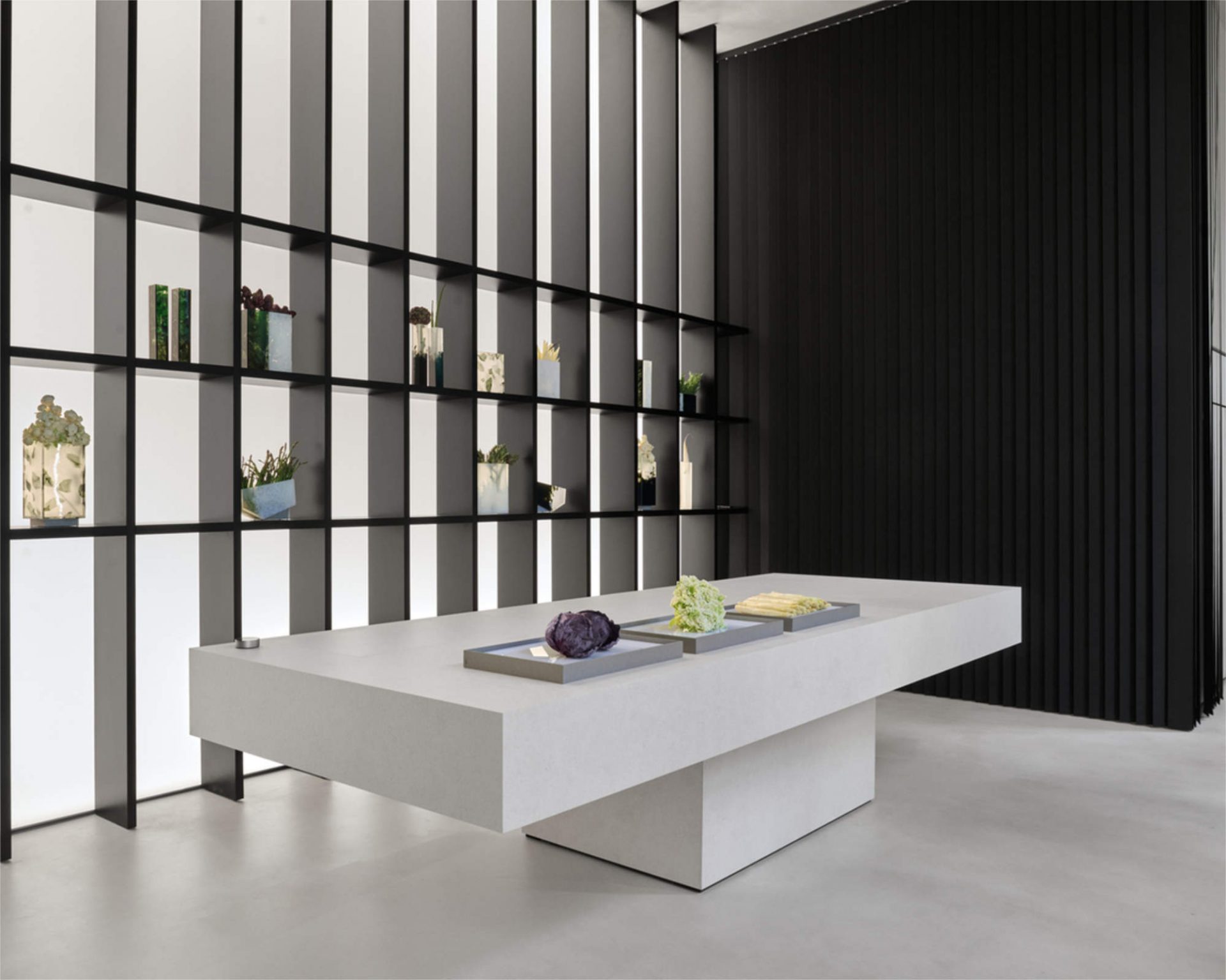 Zentrales Element der Installation ist ein langer, skulpturaler Tisch, der als multifunktionale Plattform dient. Hier wird auch „Integra“ präsentiert, ein unsichtbares Induktionssystem von V-ZUG, das nahtlos in eine Mineraloberfläche integriert ist. Die reduzierte, ruhige Gestaltung wird durch ausgewählte Küchenutensilien und Speisen ergänzt, die den gemeinschaftlichen Charakter unterstreichen.