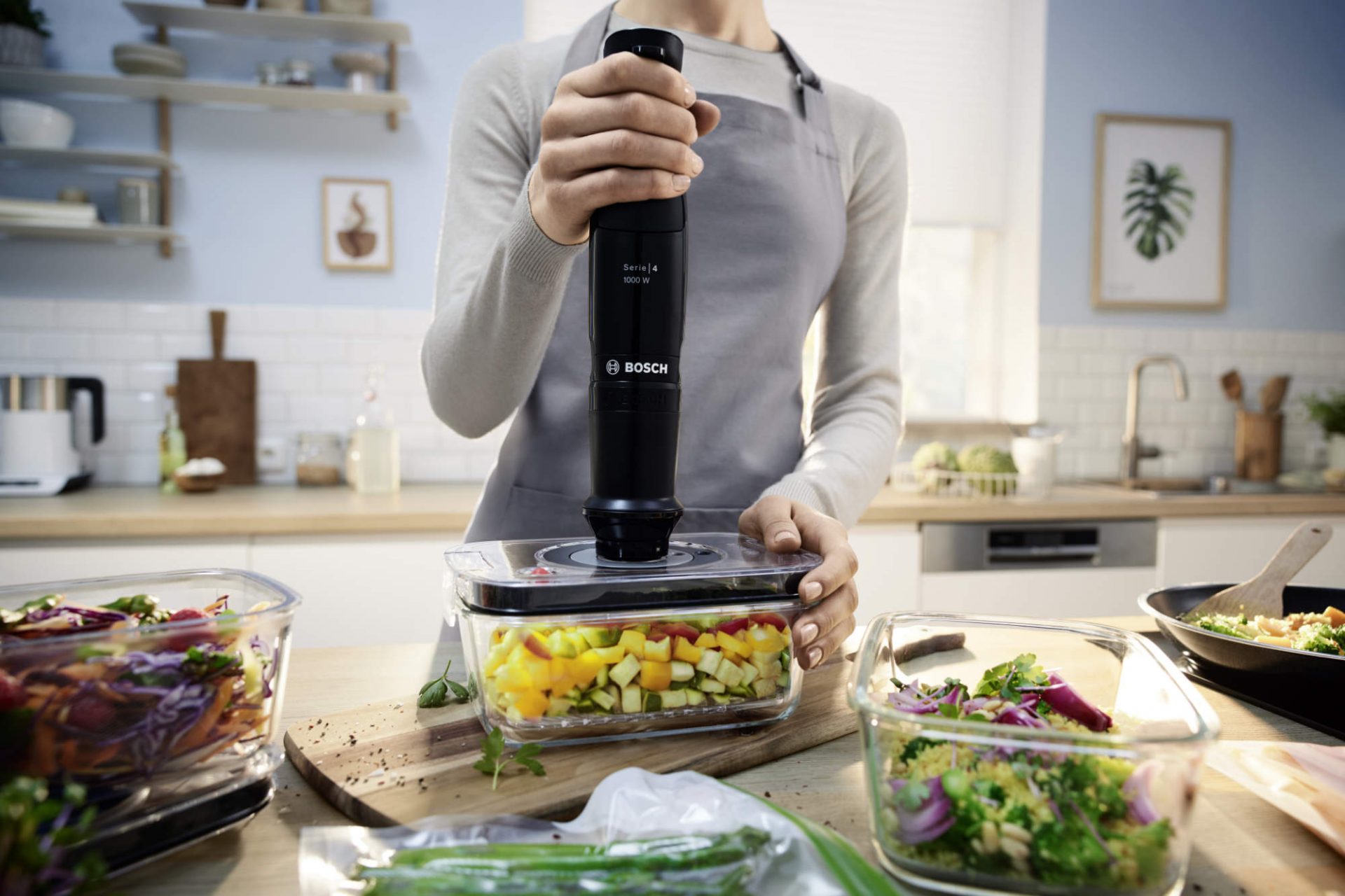 Gesund essen trotz vollem Terminkalender? Mit Meal Prep hält gesundes Essen Einzug ins Büro und Fast Food sowie ungesunde Snacks lassen sich durch vorgekochtes Essen ersetzen. Wer Mahlzeiten für mehrere Tage vorbereitet, spart Zeit und lebt bewusster. Mit dem Stabmixer ErgoMaster Serie 4 von Bosch mit Vakuum-Frischhaltesystem wird das Haltbarmachen zum Kinderspiel. Einfach die Vakuumpumpe ans Gerät klicken, auf das vorgesehene Ventil von kompatiblen Beuteln oder Frischhalteboxen setzen und auf Knopfdruck wird die Luft entfernt. Dank Vakuum-Technologie bleiben Speisen länger frisch und aromatisch – ob cremige Pasta, knackige Salate oder herzhafte Eintöpfe.